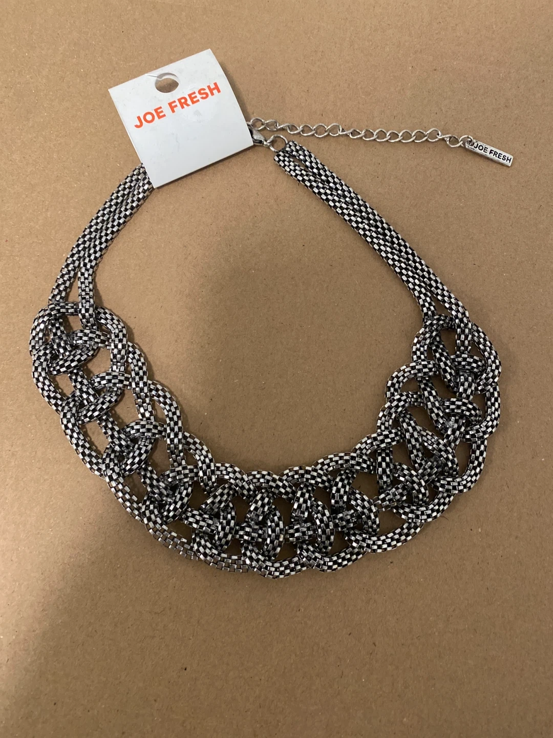 This is a Joe Fresh silver-tone statement necklace. It features a chunky, interwoven chain design. The necklace has an adjustable clasp for a custom fit.