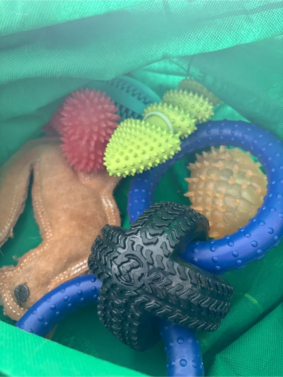 This bundle includes a variety of dog toys for playtime and chewing. Features include tough rubber, plush, and spiky balls. Great for dogs of all sizes!