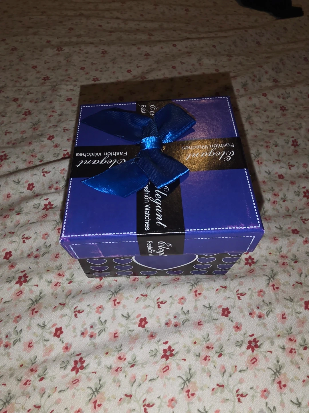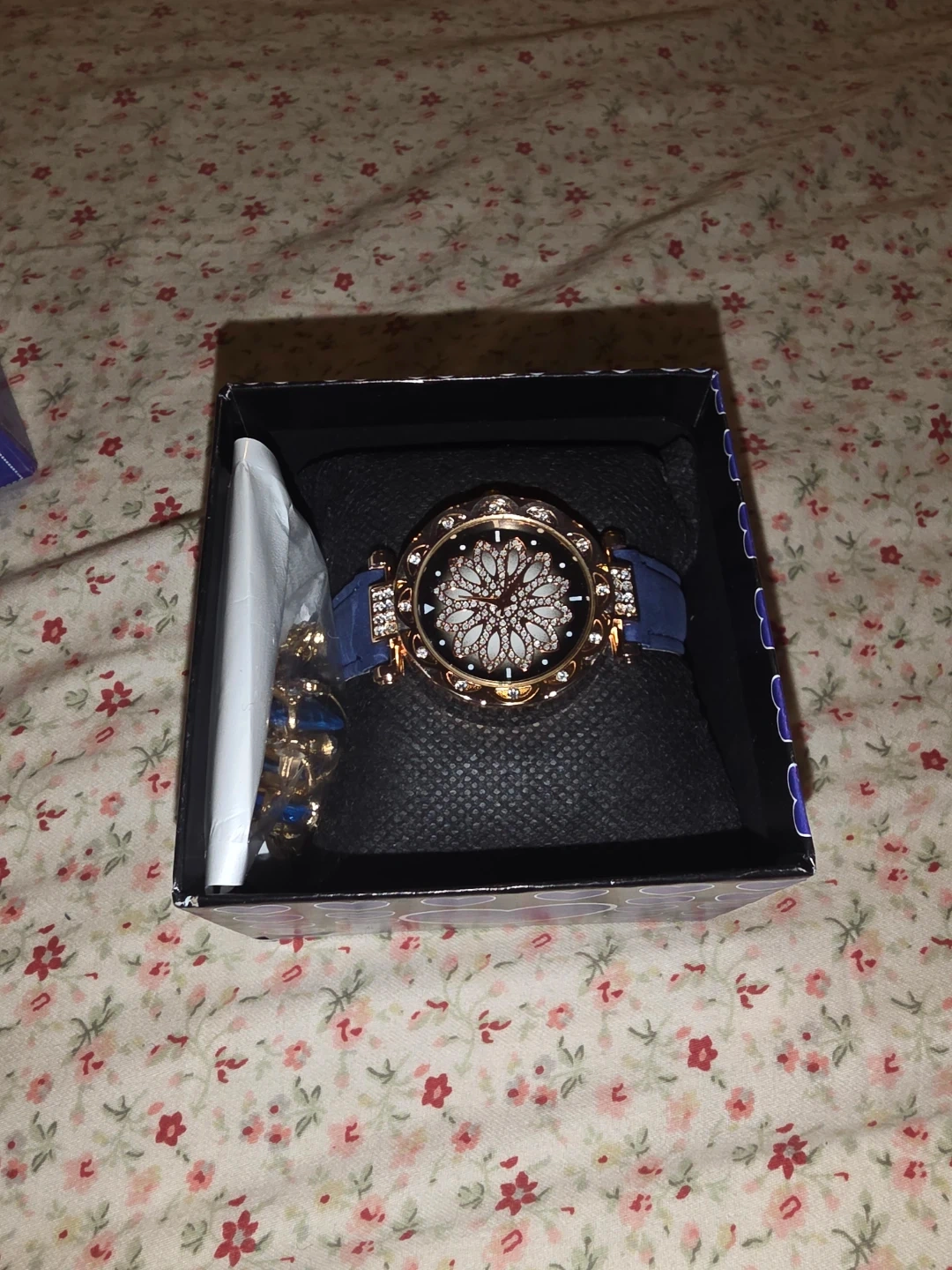 Set includes a rose gold-tone analog watch with a blue leather band, necklace, earrings, and ring. The watch face is adorned with crystal accents and features a floral-inspired design. It's presented in a decorative gift box.