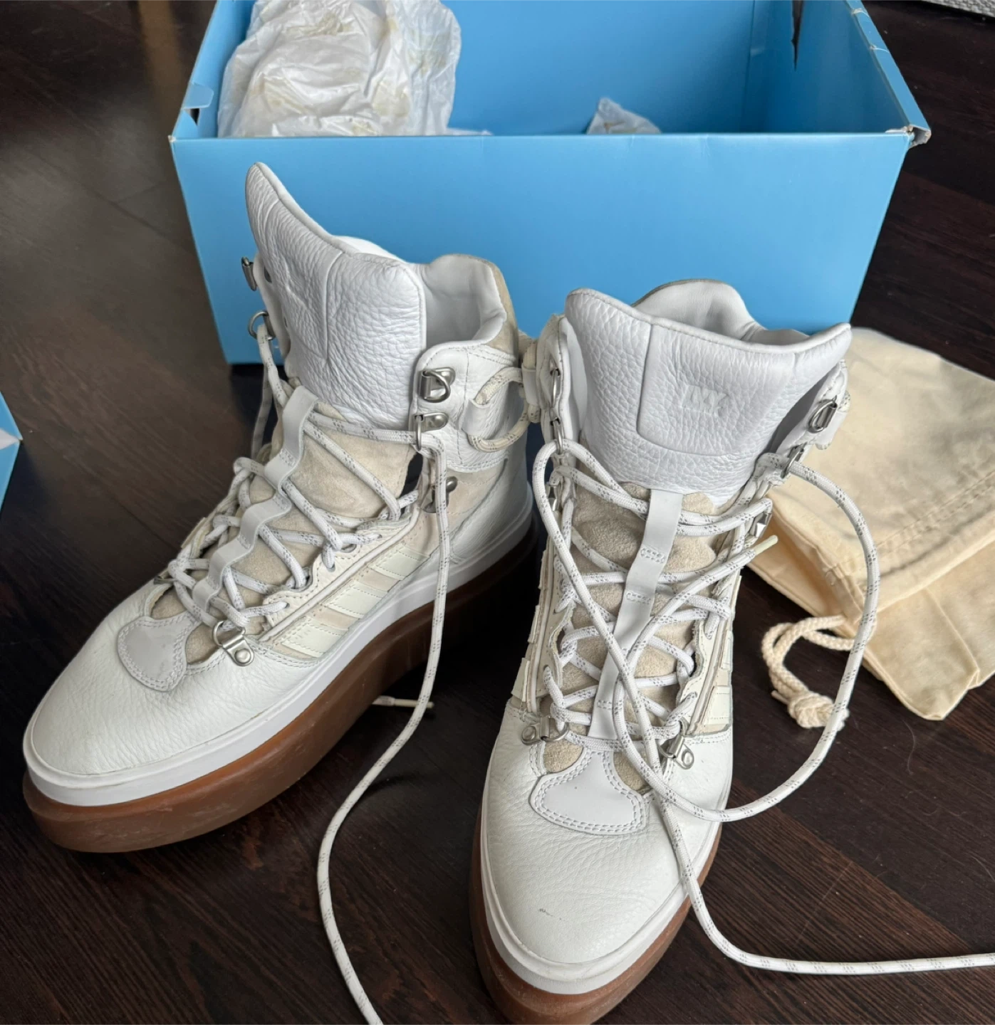 White leather and suede high-top boots. Features a gum sole and lace-up closure. Includes original box and dust bag.
