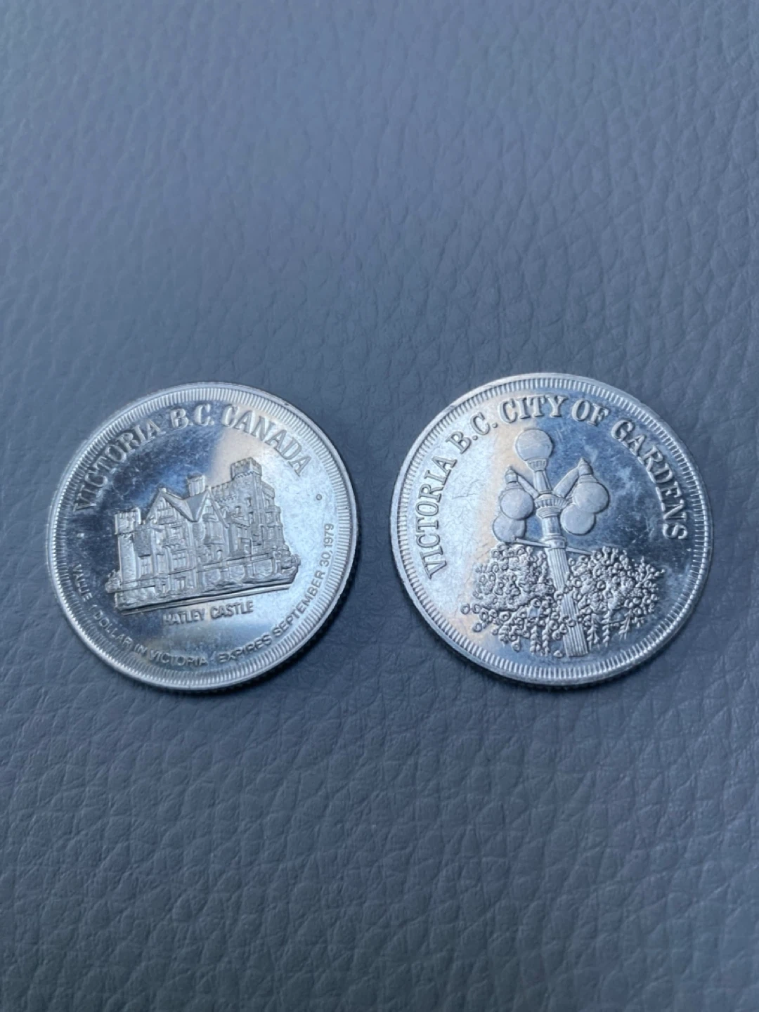 Selling two commemorative coins from Victoria, B.C. Both expire September 30, 1979, according to the text on the coins