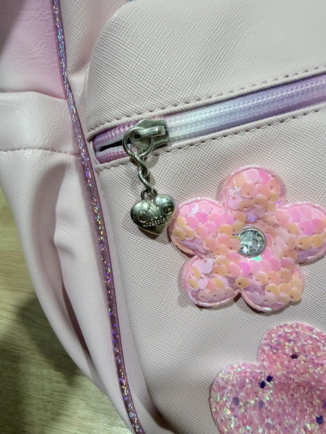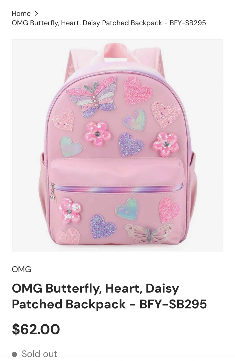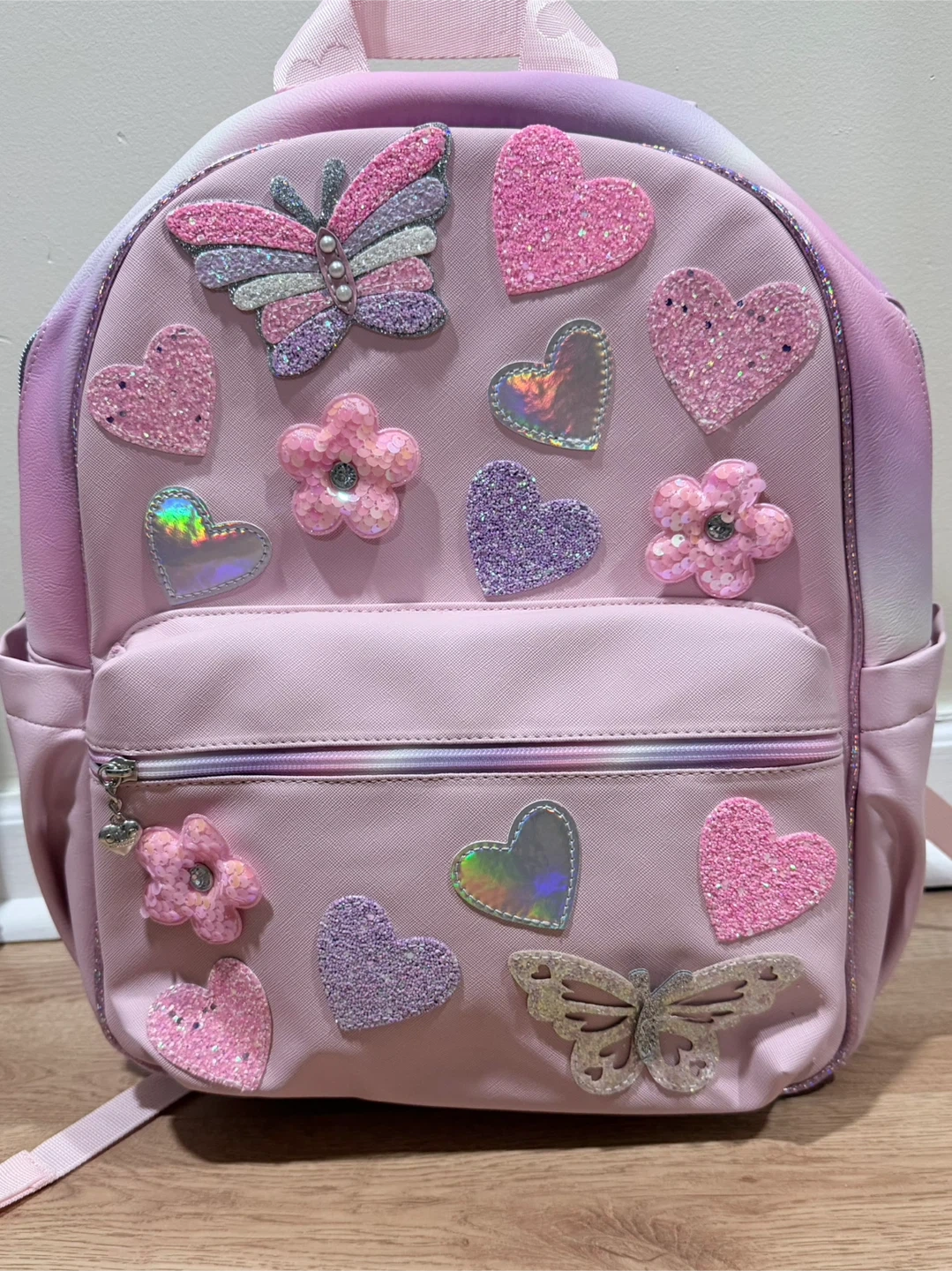 This OMG backpack is pink with a fun butterfly, heart, and daisy patch design. It features glitter accents and iridescent details. Includes a front zipper pocket and side pockets.