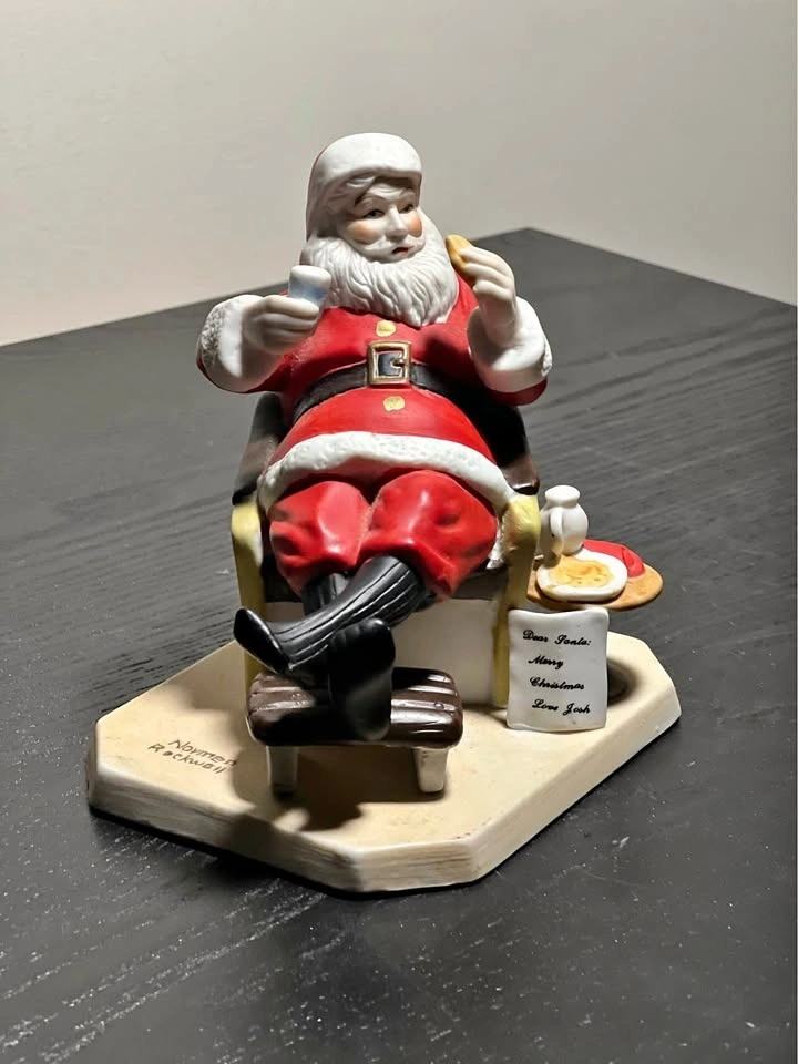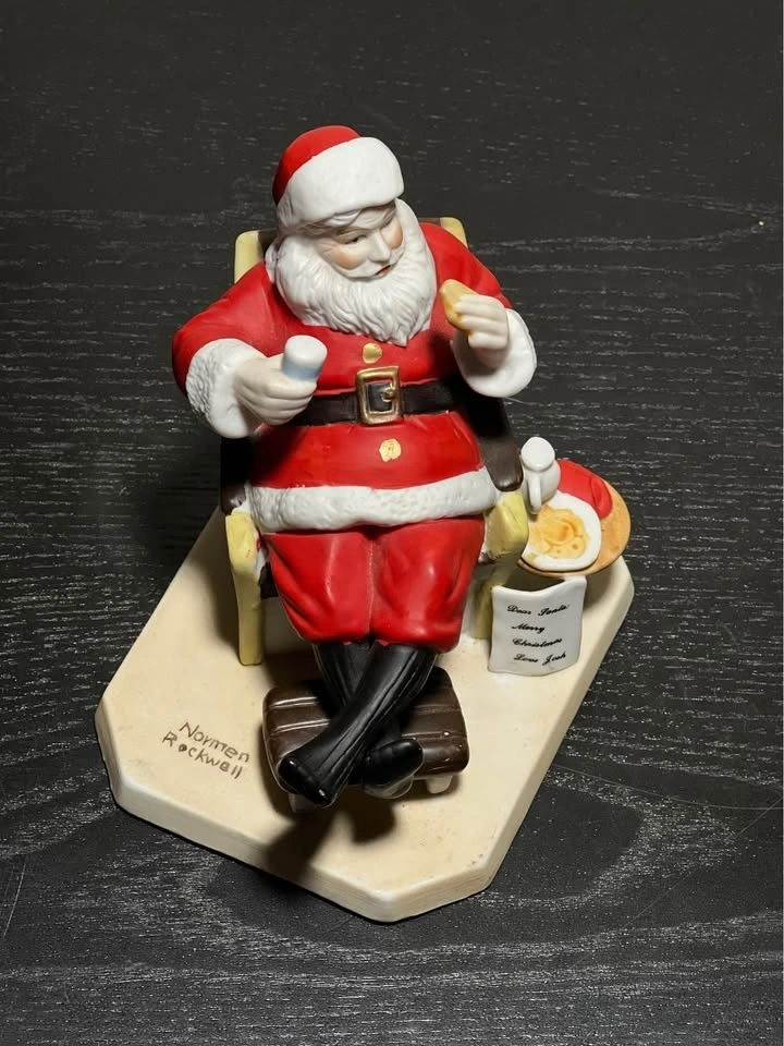 131Official Norman Rockwell Archive Collectible. This figurine is the "Santa's Snack" piece from the Norman Rockwell Whitney Heritage Collection. It is a popular Christmas collectible that captures the classic Rockwell painting of Santa Claus enjoying a treat during his Christmas Eve rounds. The figurine features Santa in his classic red suit and cap, with a white beard and a jovial expression. The attention to detail in the sculpting and painting of the figurine is truly impressive. Artist: Norman Rockwell Collection: Whitney Heritage Collection Material: Hand Painted Porcelain Details: The figurine depicts Santa sitting in a chair, holding a glass of milk and a cookie, with a small table next to him holding a plate of more cookies and a note. Measures 5” height and the base is 5” x 4” Pre owned Pickup is 58th and 7th Ave in midtown Manhattan