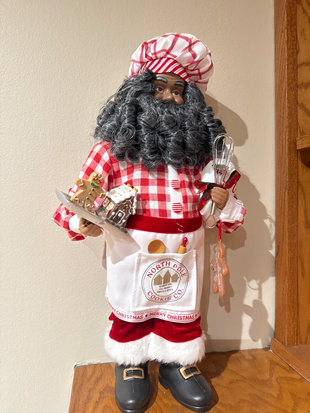 10This is a cute Santa figurine from North Pole Cookie Co. He's dressed as a baker with a chef's hat and apron, holding a tray of gingerbread cookies and a gingerbread house. He's ready to add some holiday cheer to your home!