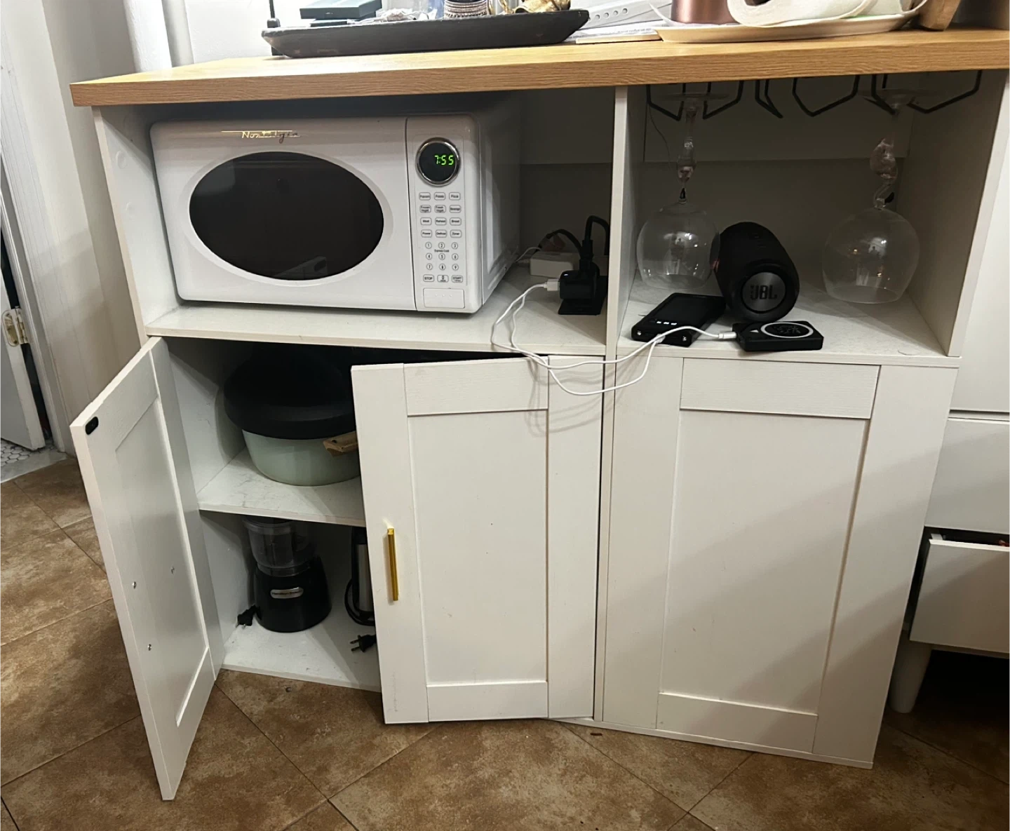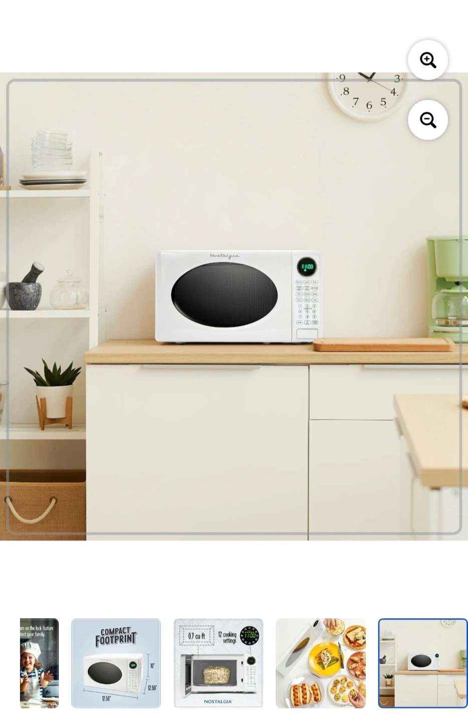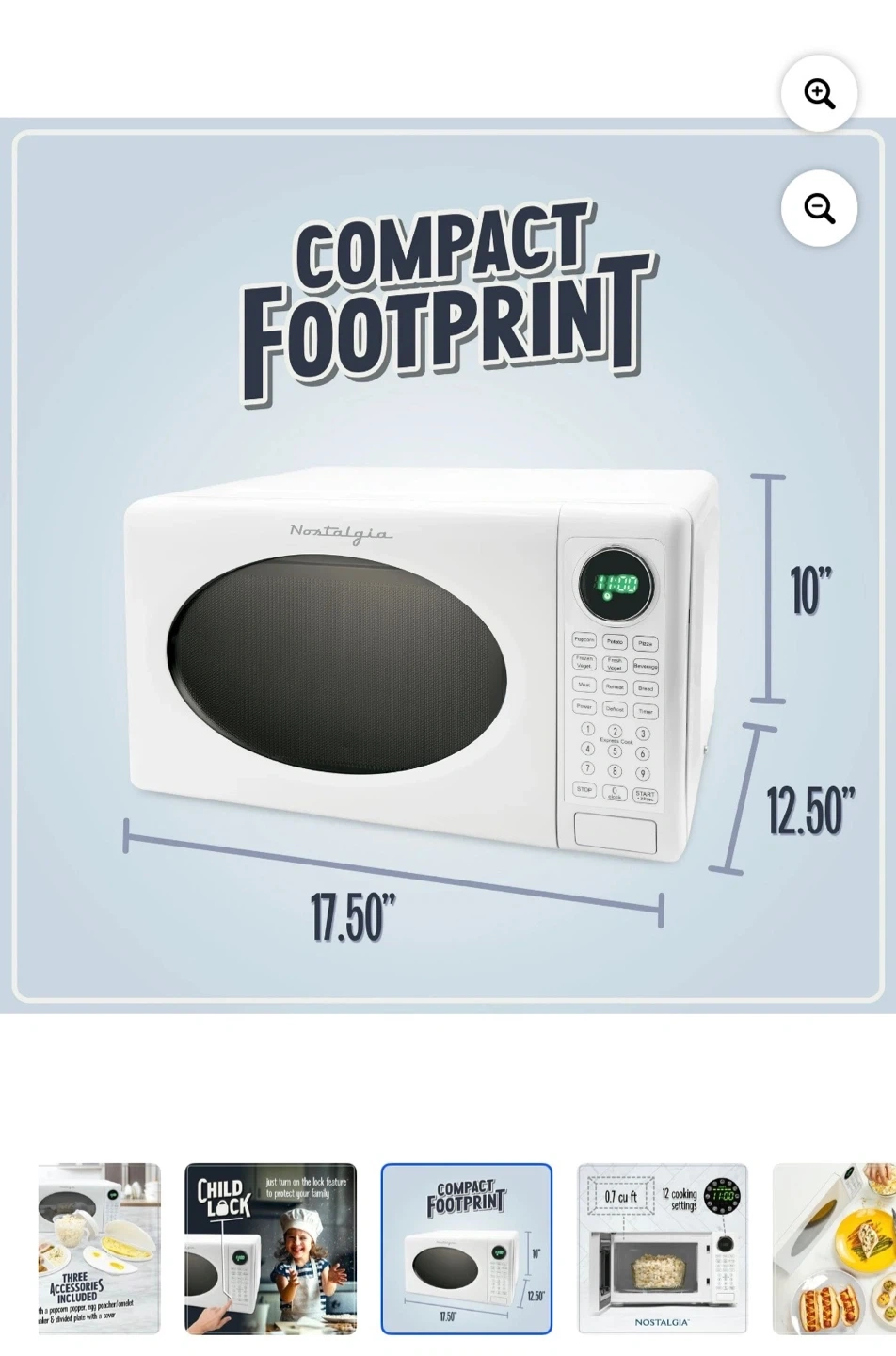 Selling a Nostalgia 0.7 cu ft retro countertop microwave in white. It has a compact footprint and 12 cooking settings. Dimensions are 17.5" x 12.5" x 10". A great addition to any kitchen!