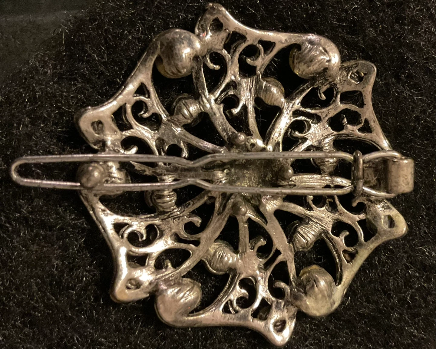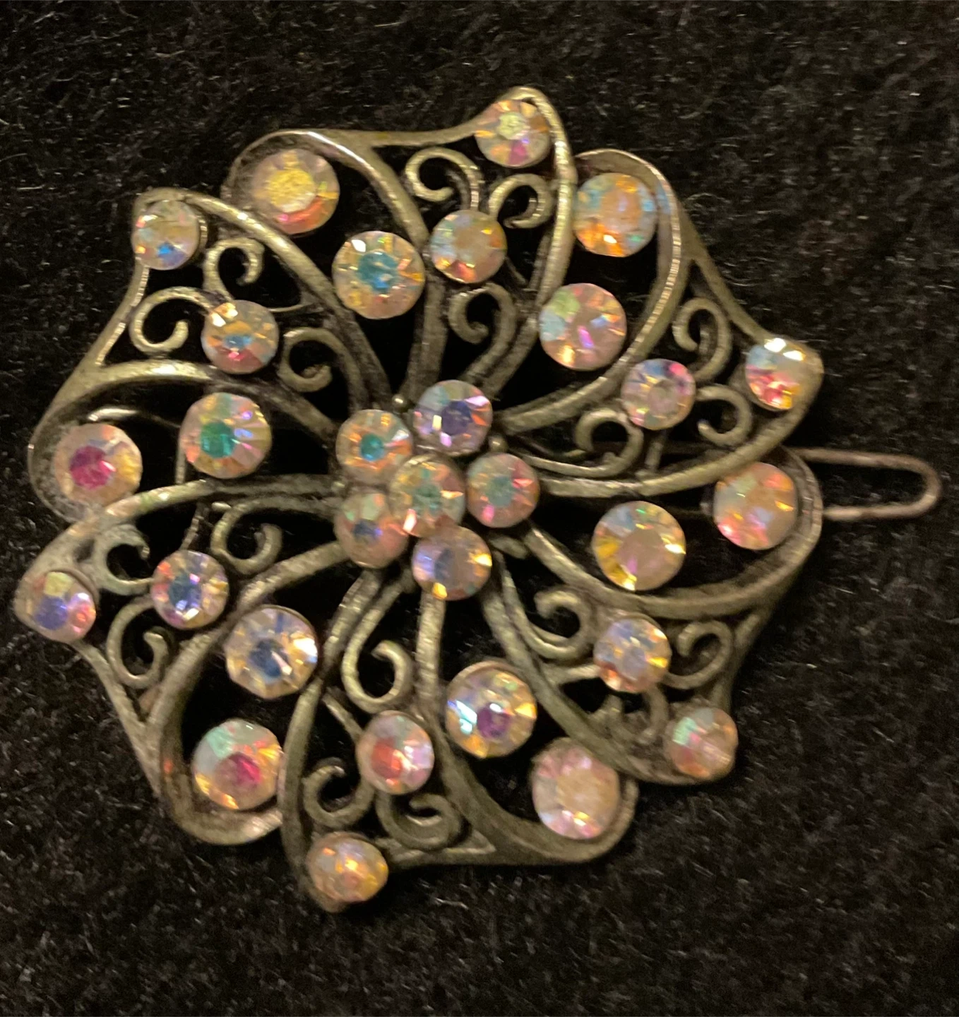 RHINESTONE HAIR BARRETTE.. style hair clip with a beautiful floral design. It features intricate metalwork and sparkling iridescent rhinestones. Perfect for adding a touch of elegance to any hairstyle!