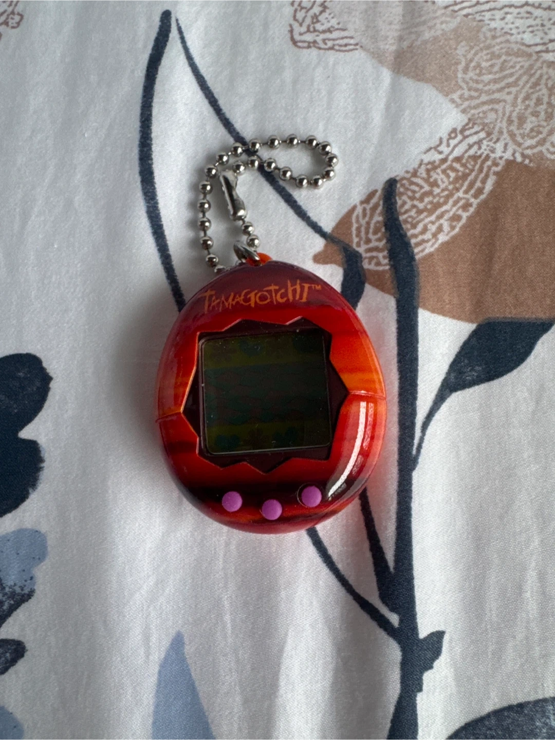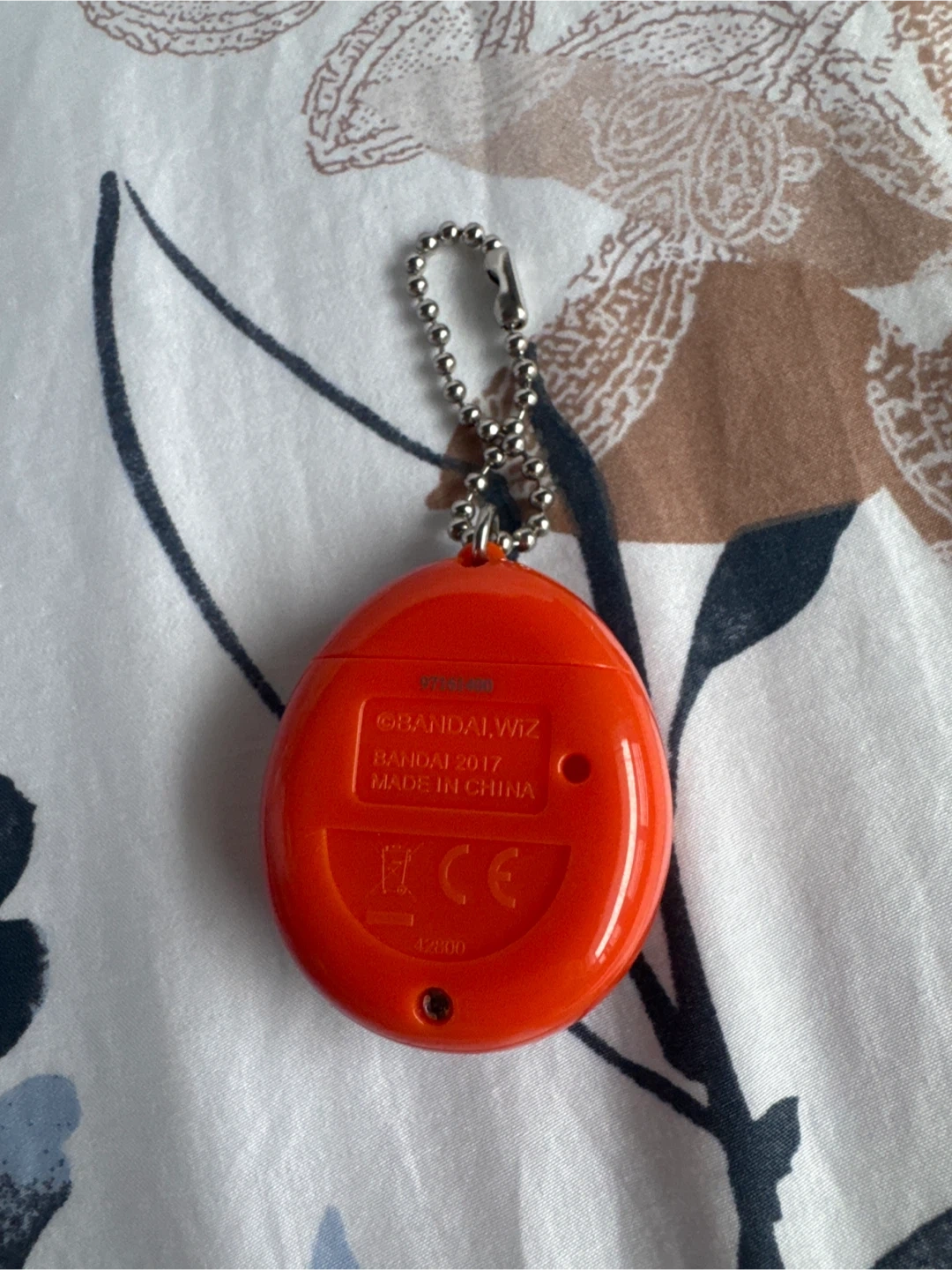 This is a Tamagotchi virtual pet keychain. It's a fun digital toy that requires care and attention. Perfect for those who enjoy retro gaming or want a small, engaging distraction.