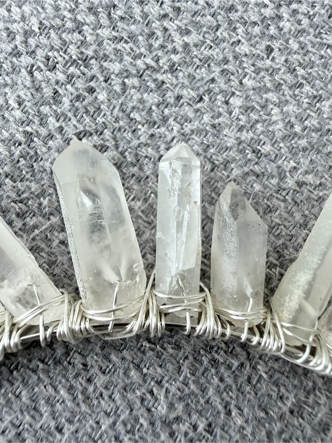 Featuring clear quartz-style crystal points wrapped by hand on a metal base, this piece creates a unique, ethereal look that instantly elevates any outfit.