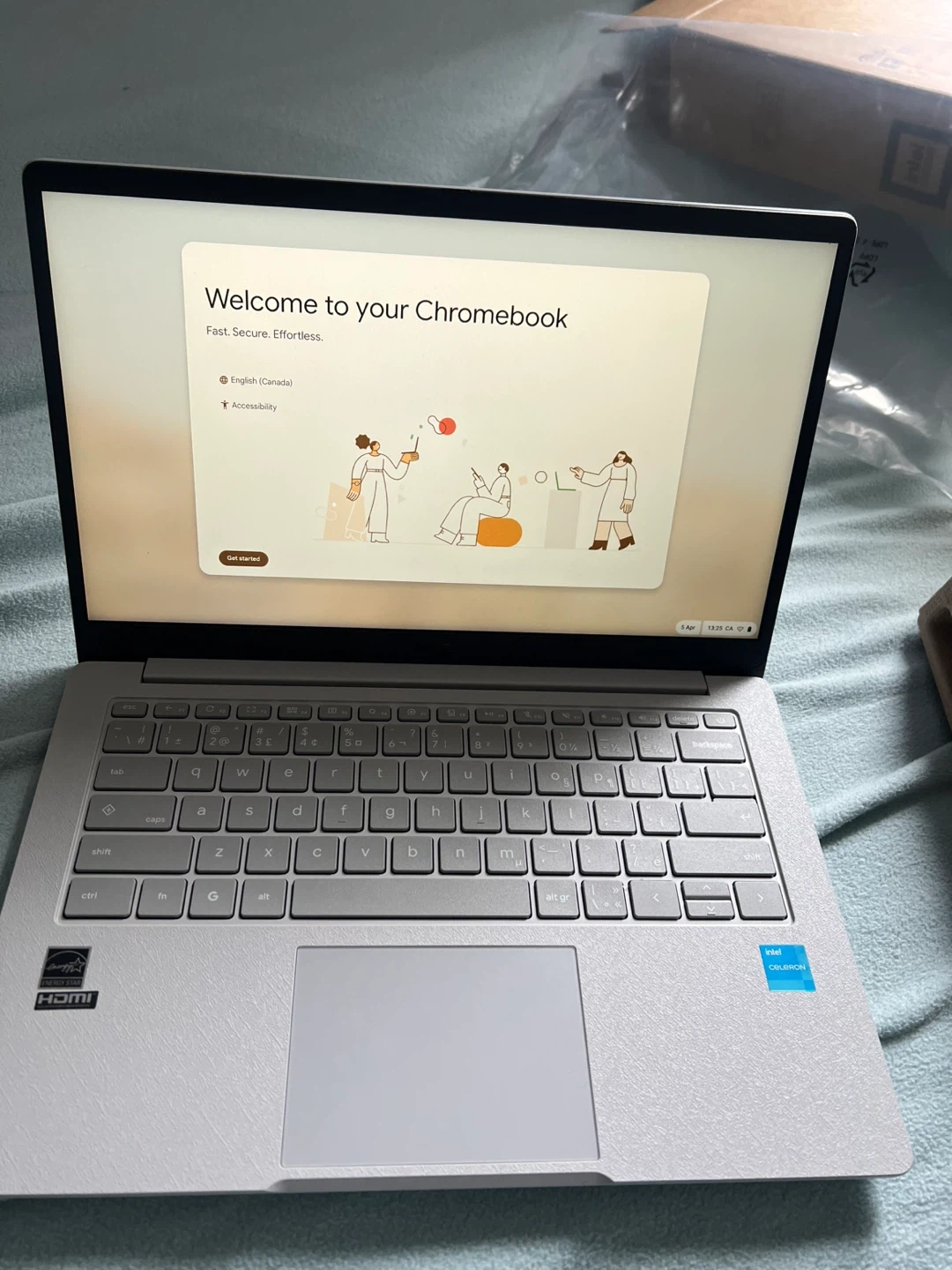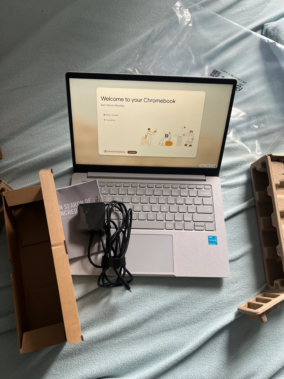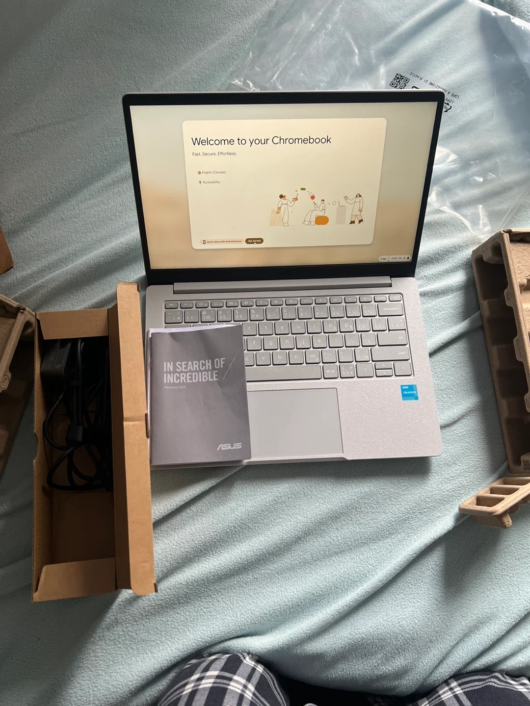 This ASUS Chromebook comes with its original box and manual. It's a silver model with a clean keyboard layout. This device is great for everyday browsing and schoolwork!