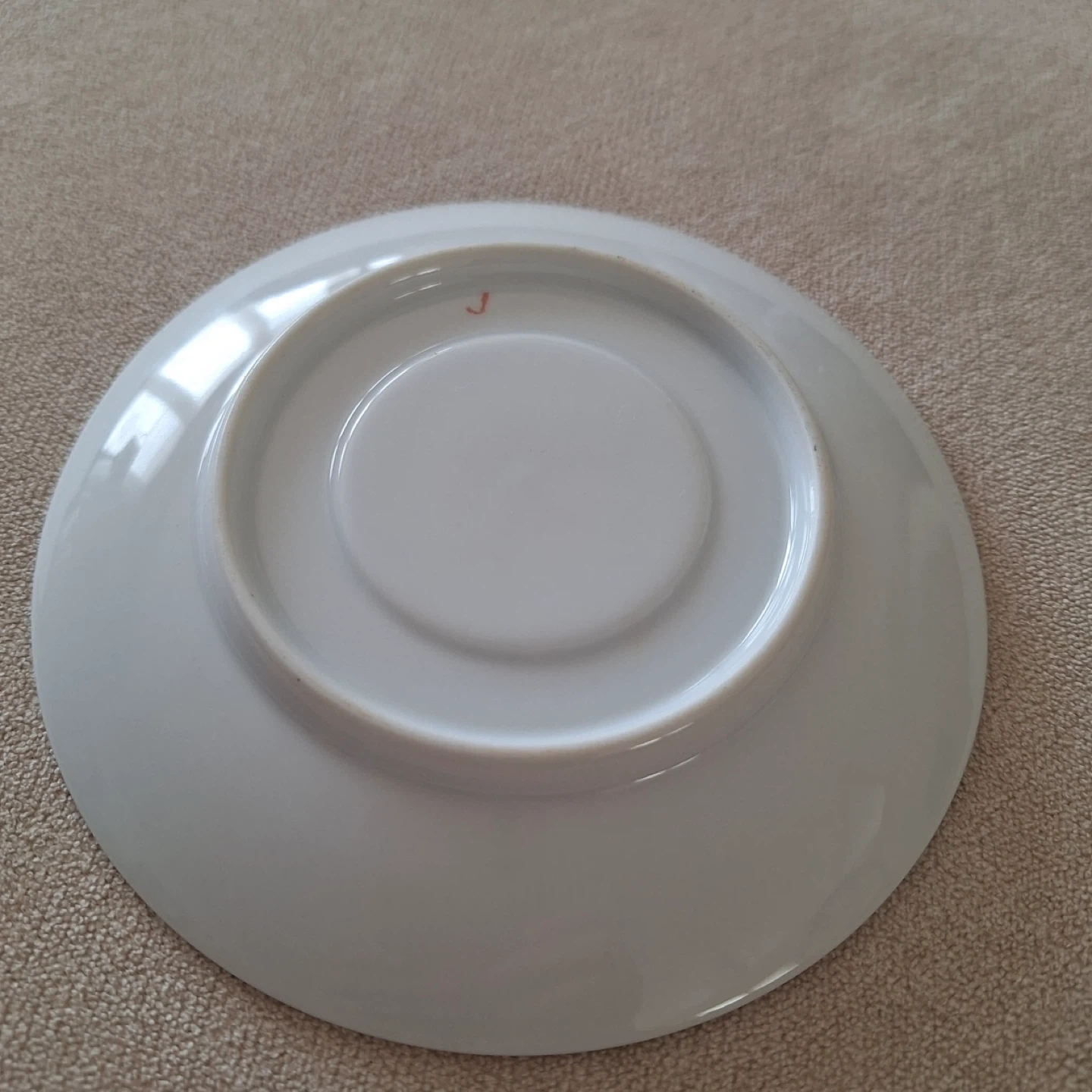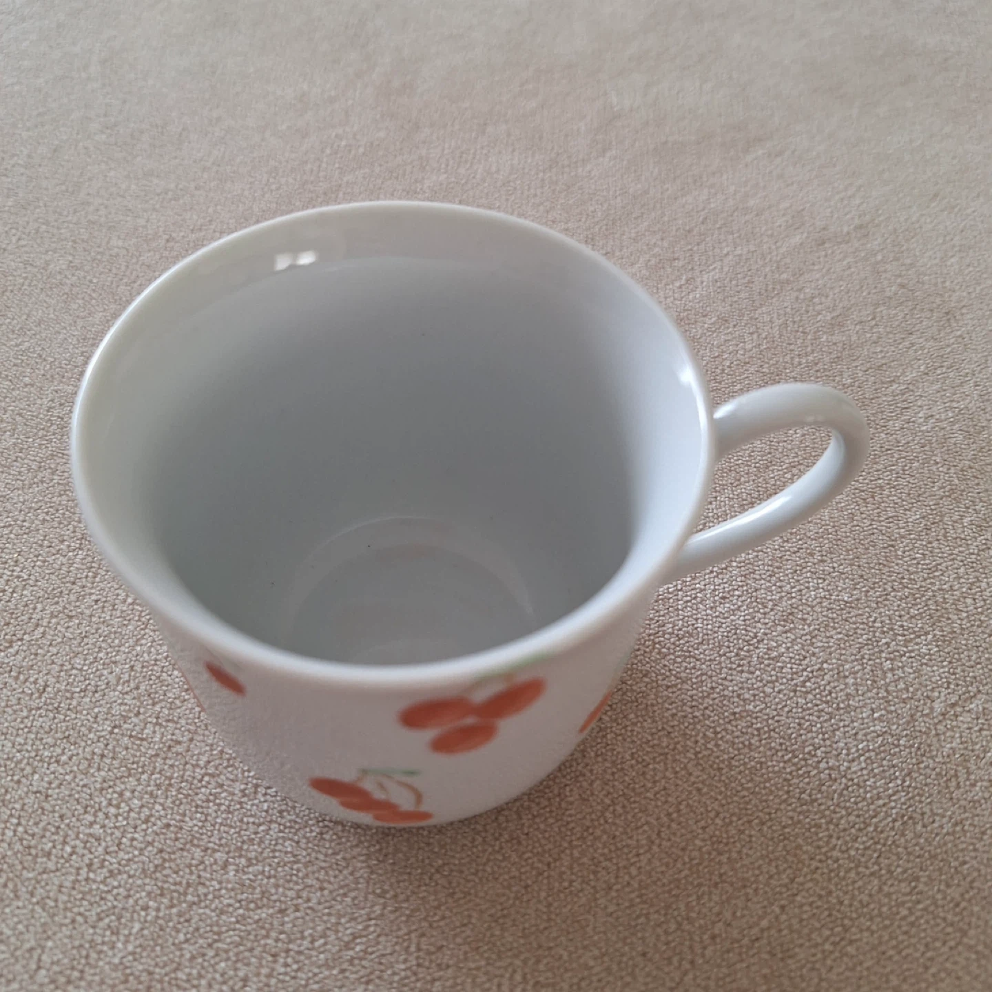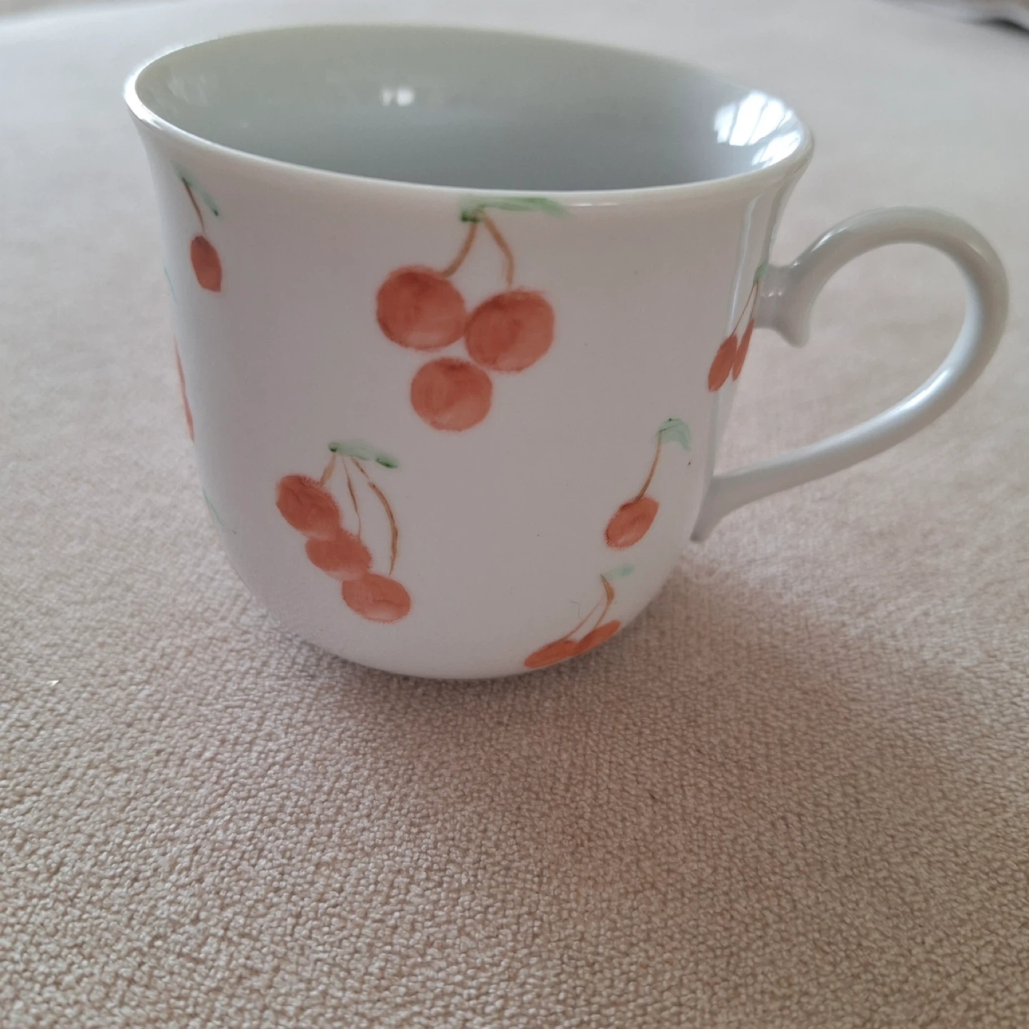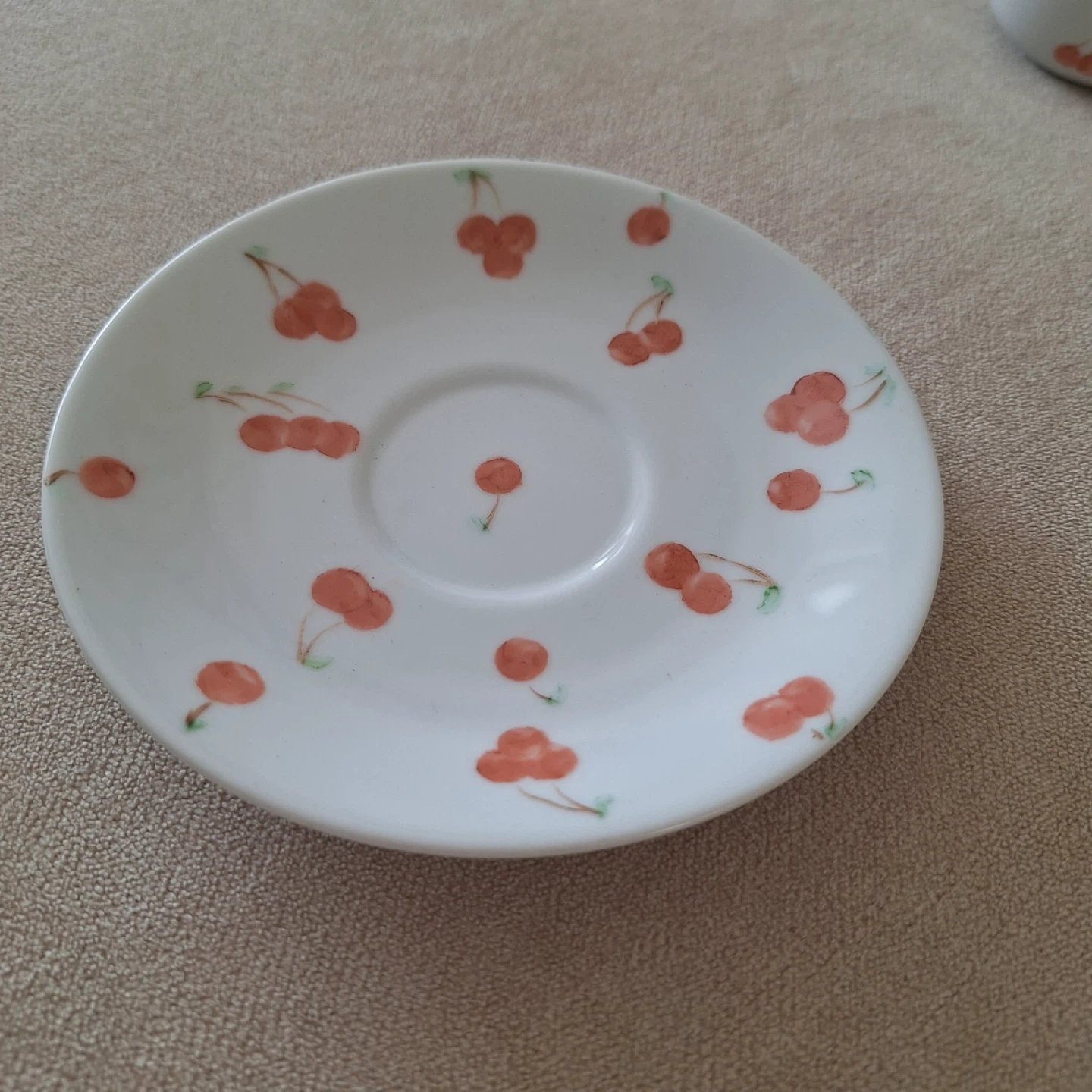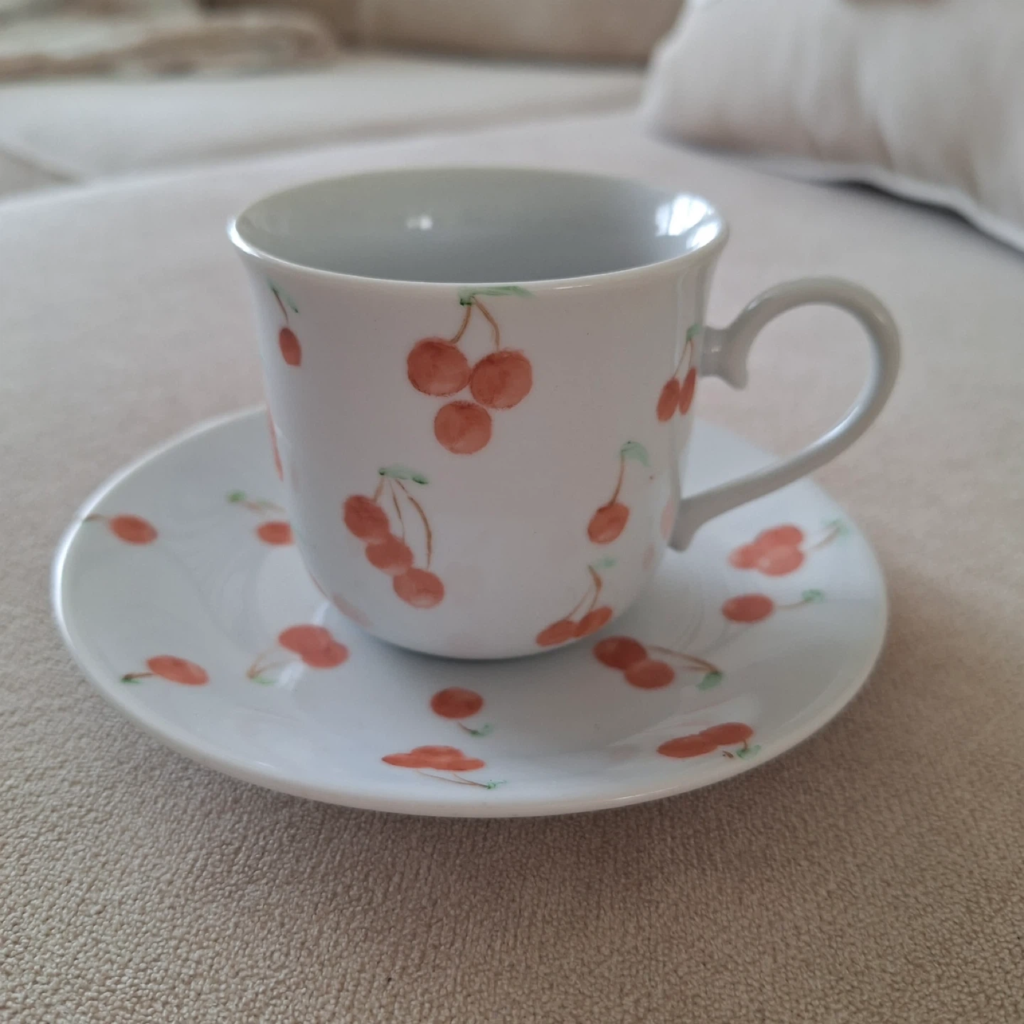 A sweet teacup and saucer set featuring a hand-painted cherry design. It's made of white ceramic with a glossy finish. This set is perfect for enjoying your morning coffee or afternoon tea!