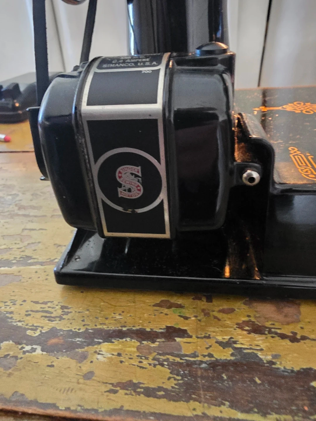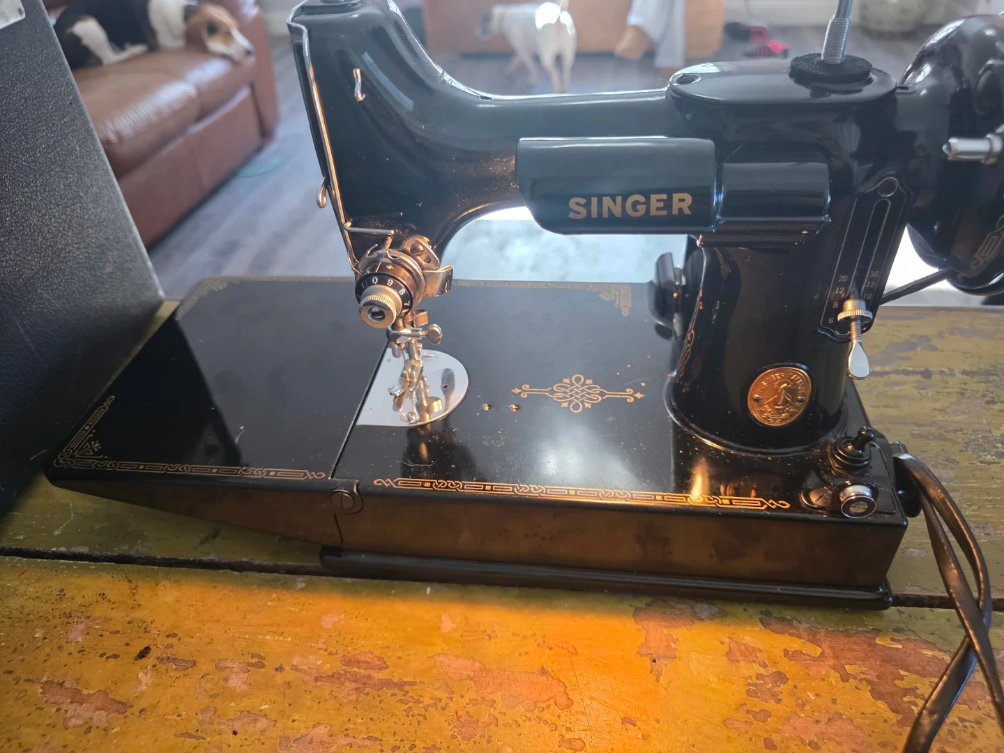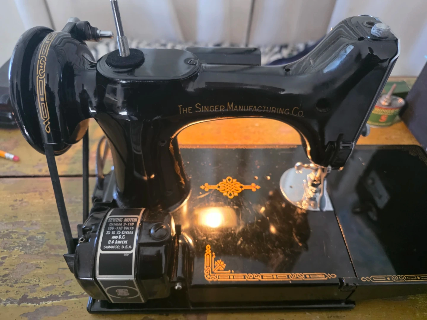 Vintage 1945 Singer Model 221 sewing machine (Serial #AG545804), allotted September 19, 1945 from Singer’s Elizabethport, New Jersey factory.