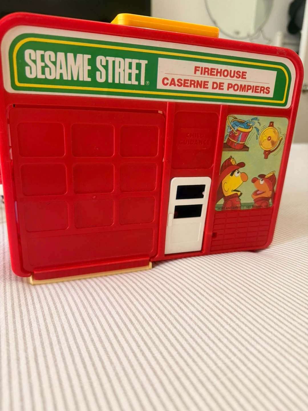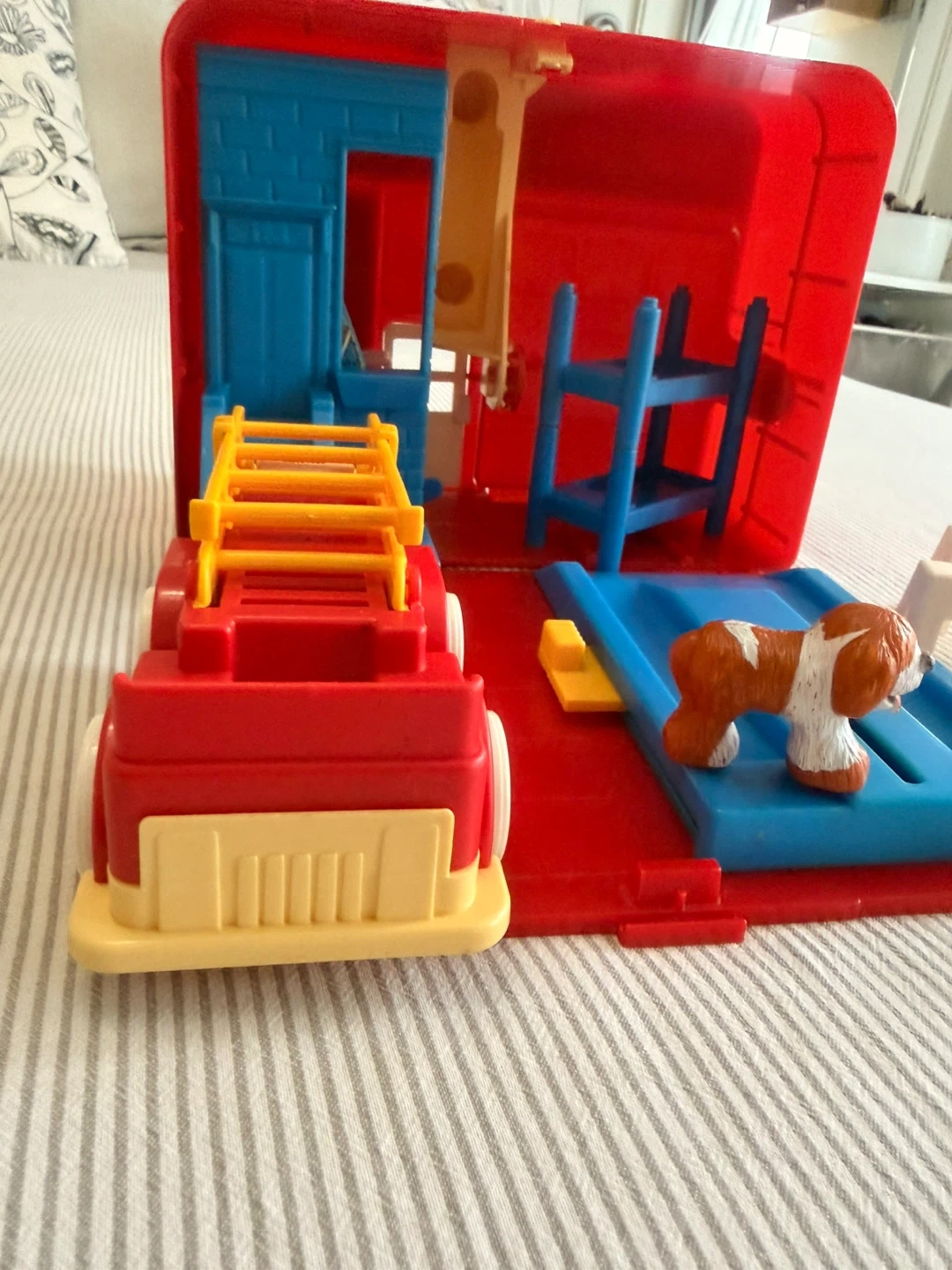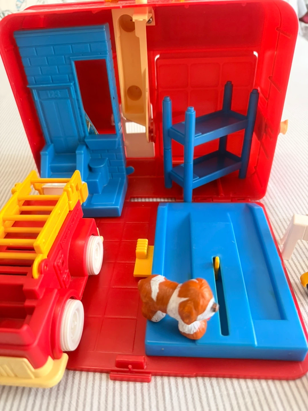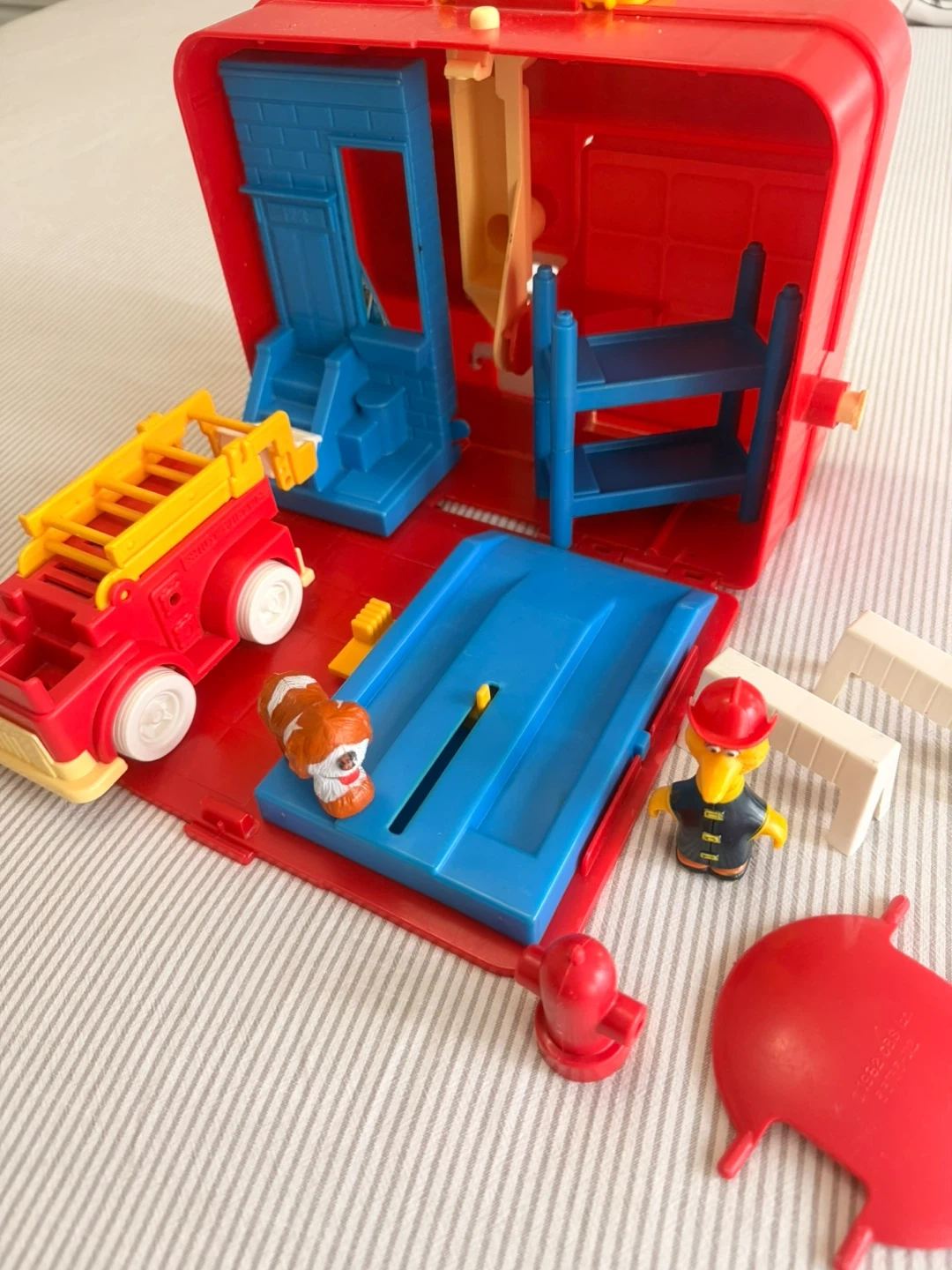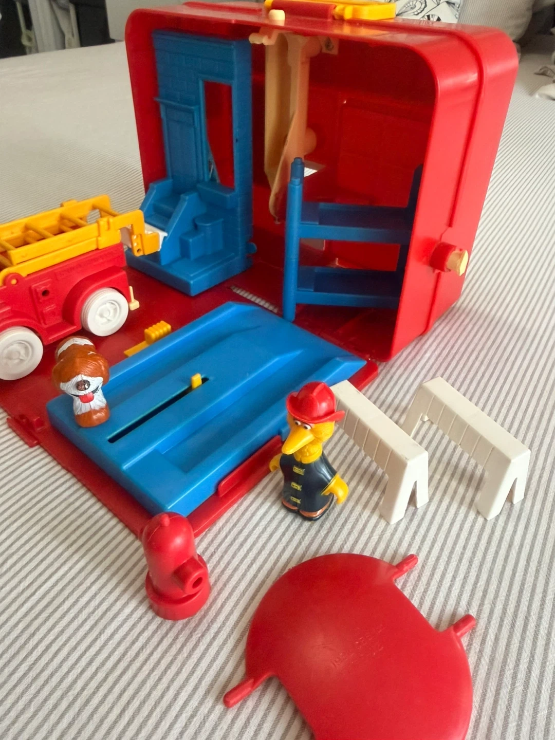 This is a Sesame Street Firehouse playset. It includes a red and yellow fire truck, a dog figure, and several other character figures. The playset folds open to reveal the interior. It's made of durable plastic.