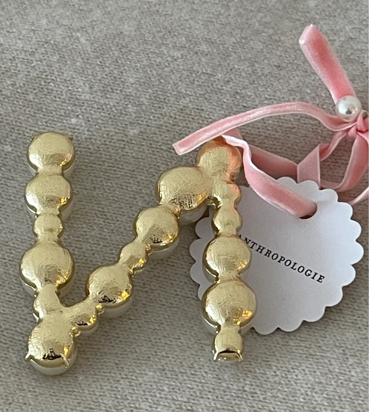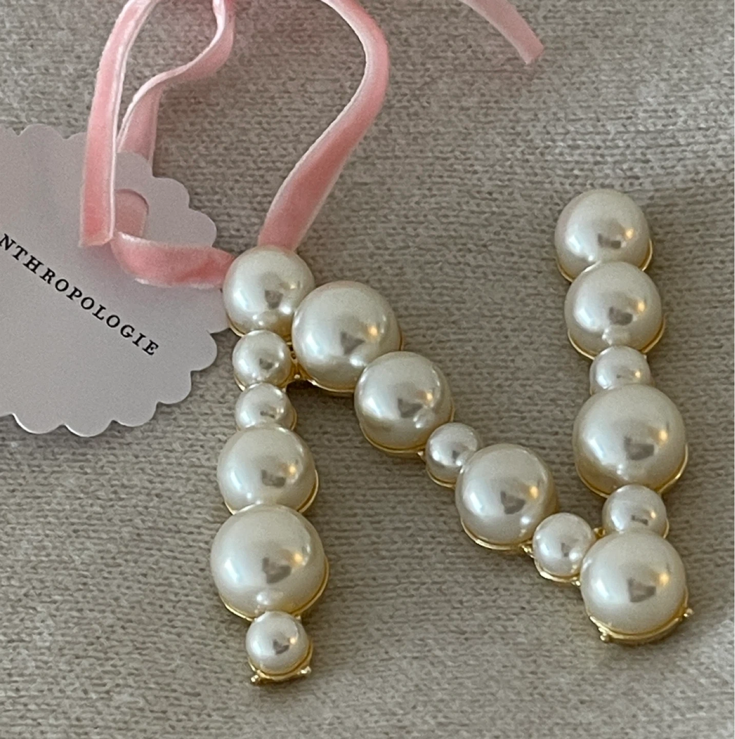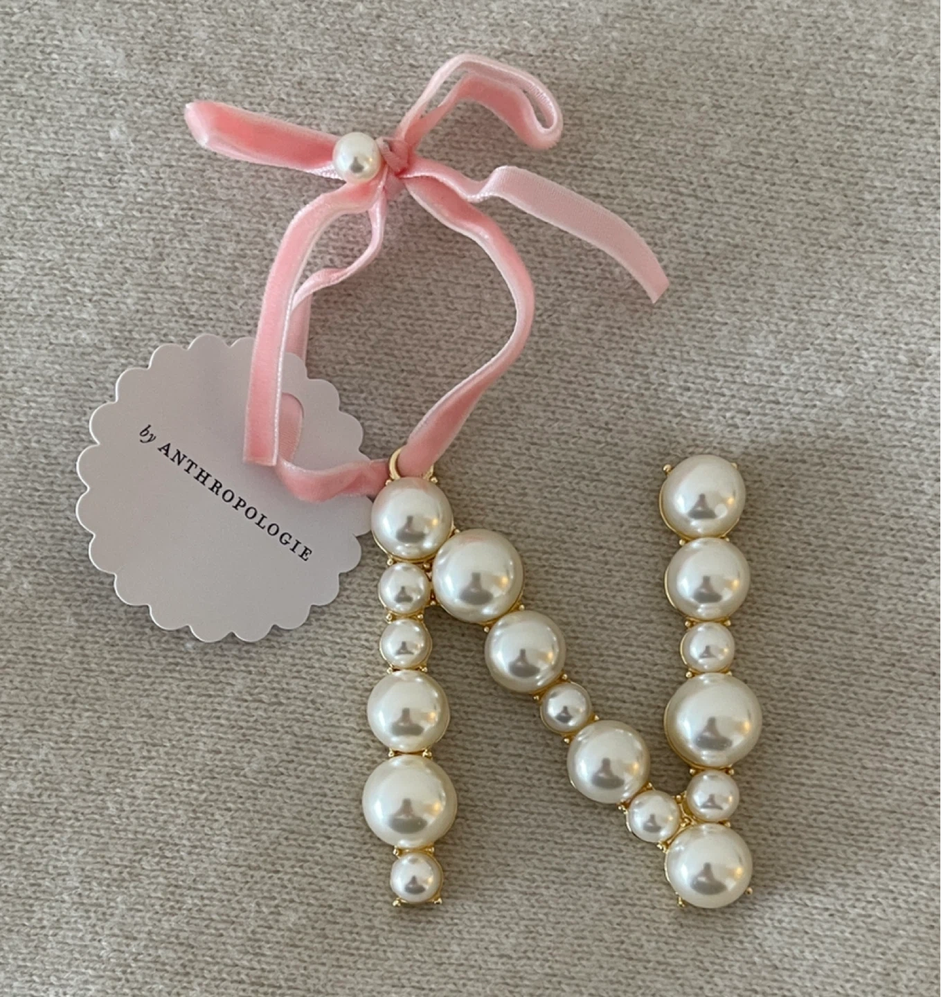 Anthropologie pearl initial ornament "N". Features faux pearls and gold-tone metal. Includes pink velvet ribbon for hanging. Perfect for decorating a nursery or personalizing a gift!