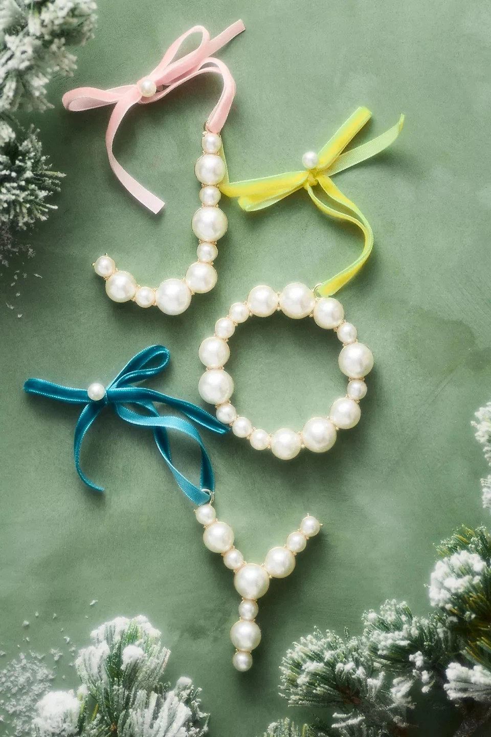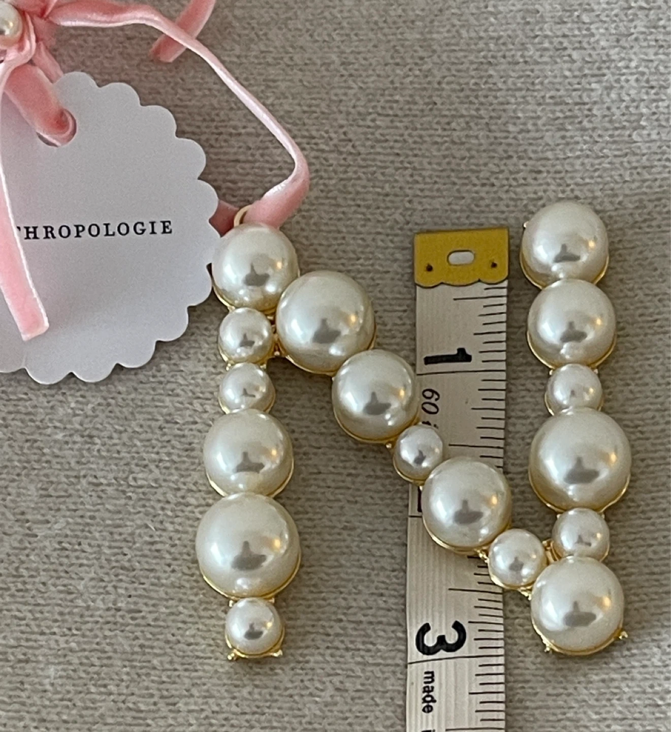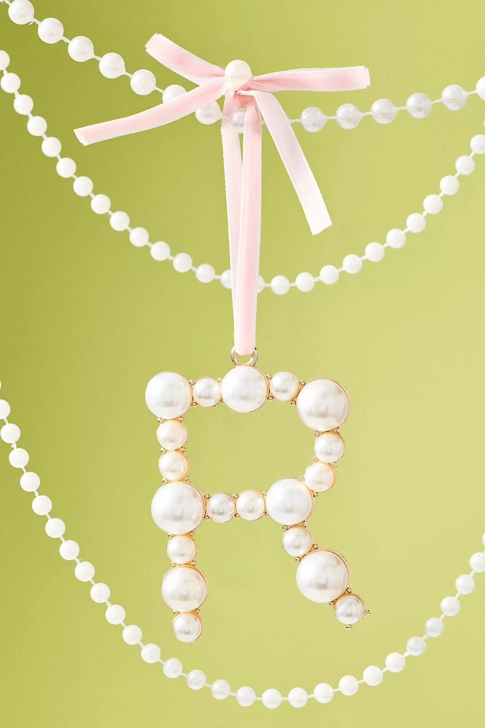Anthropologie pearl initial ornament "N". Features faux pearls and gold-tone metal. Includes pink velvet ribbon for hanging. Perfect for decorating a nursery or personalizing a gift!