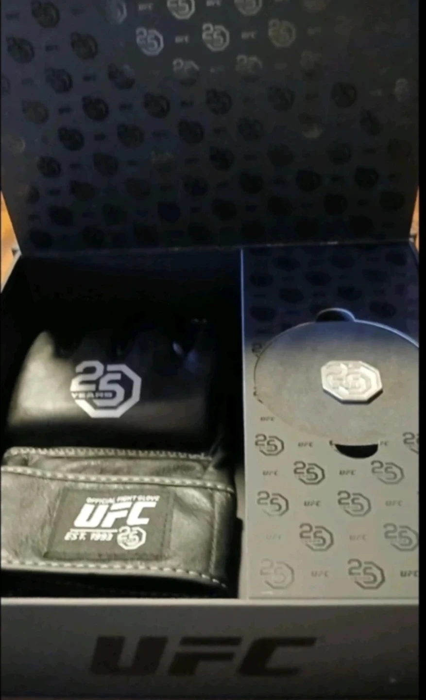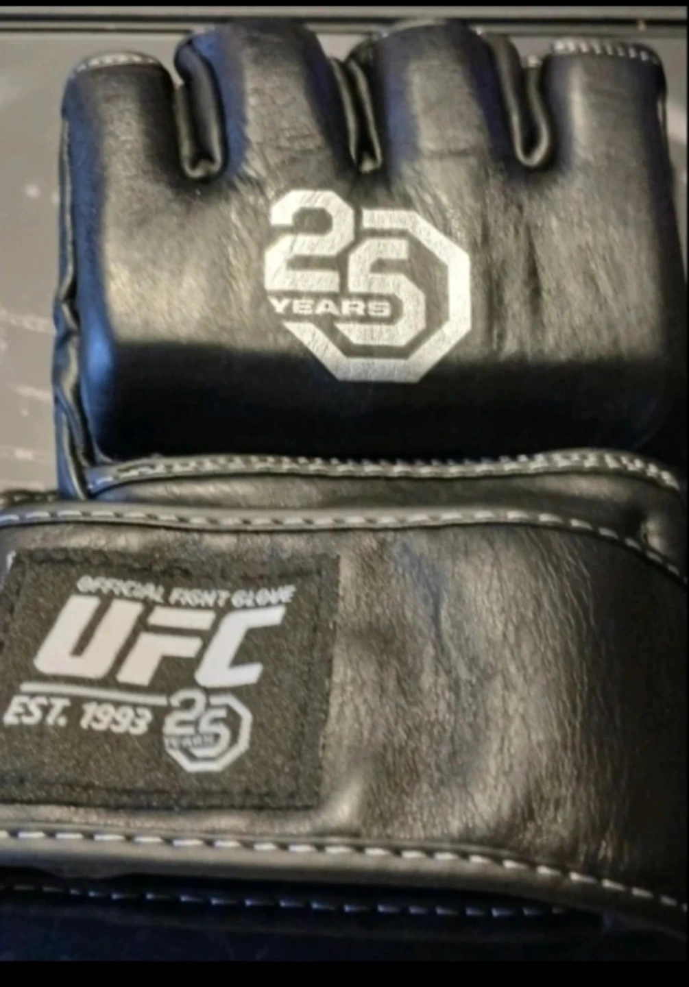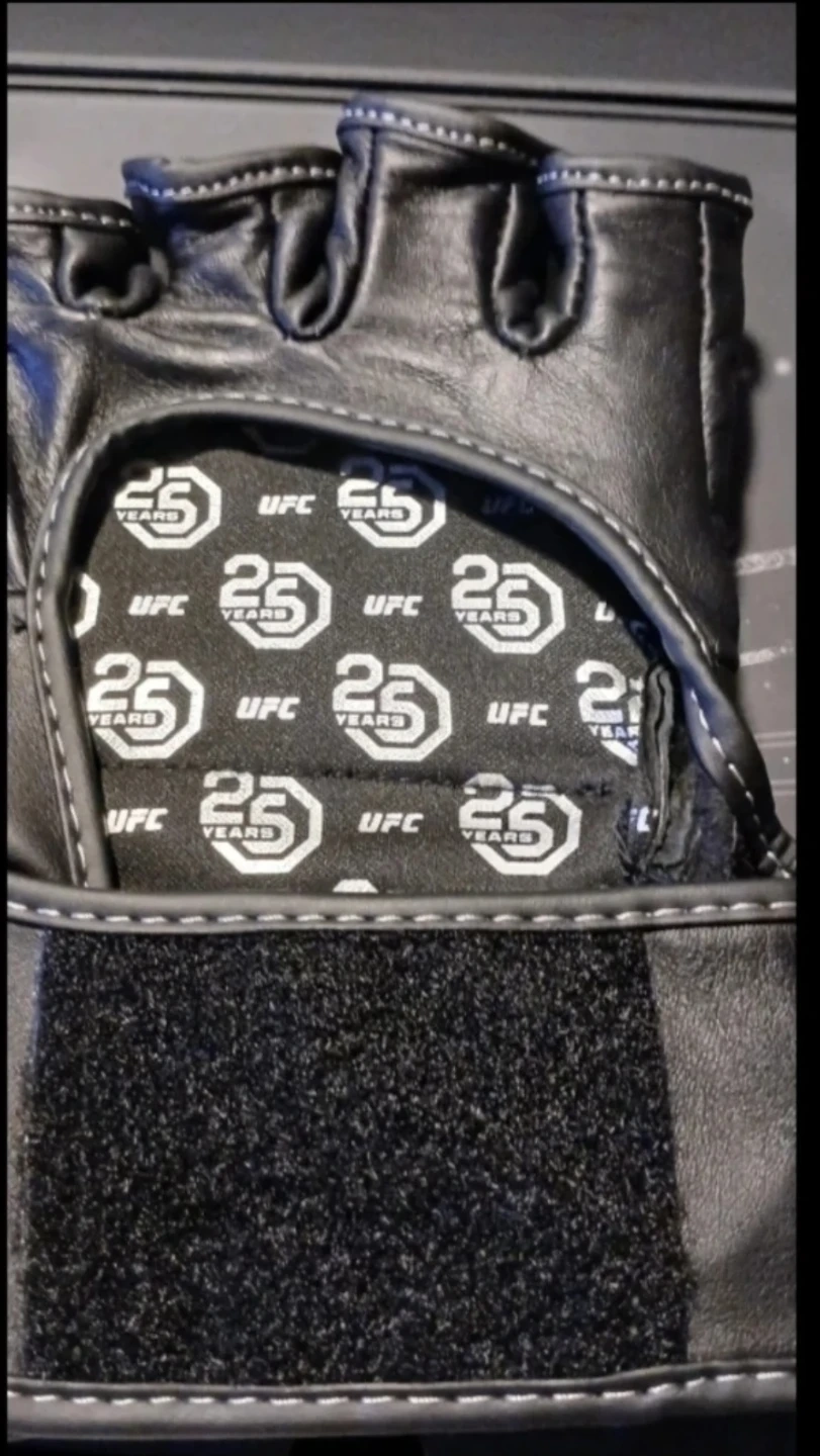 -these special edition UFC leather gloves feature a 25th anniversary silver UFC logo inside and out