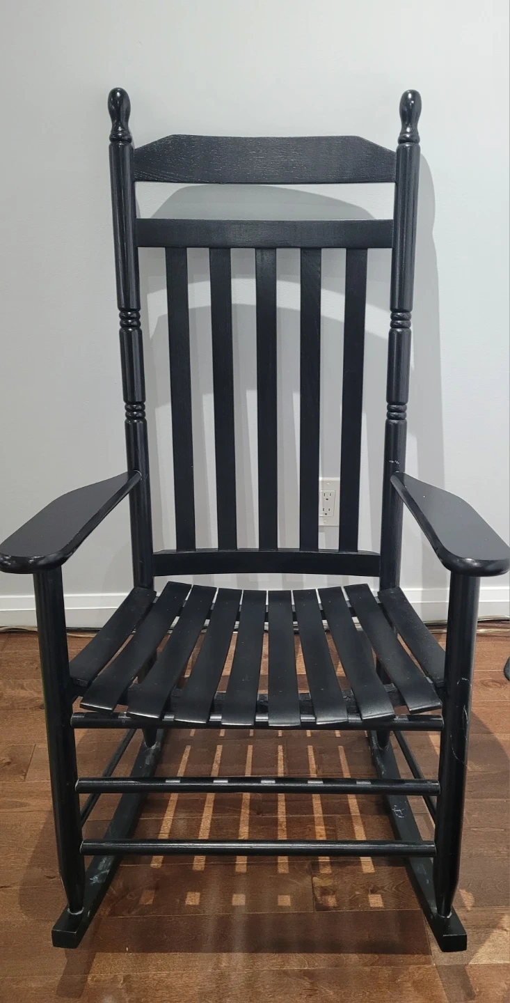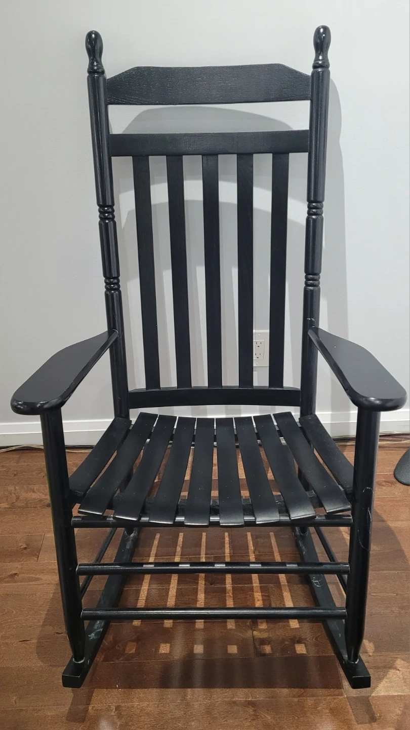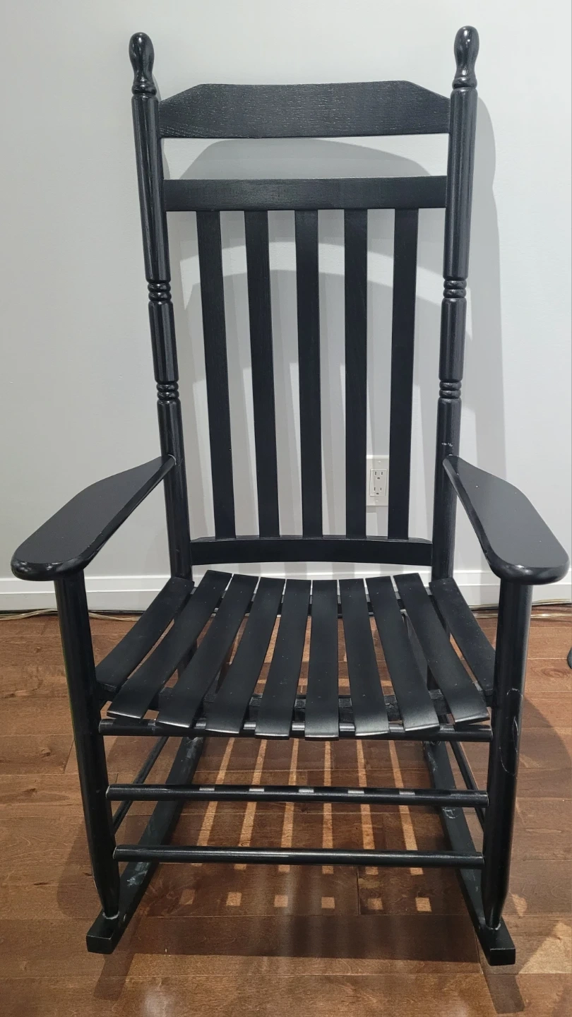 Here's a classic black wooden rocking chair! It's perfect for relaxing on the porch or in your living room. It's in great condition and ready for a new home!