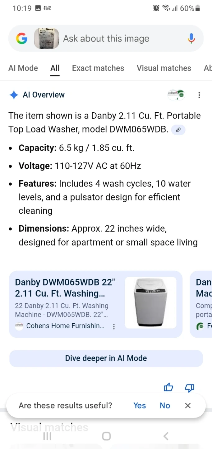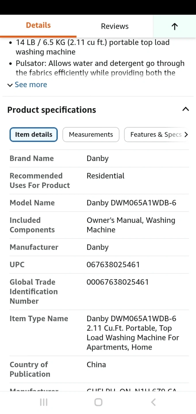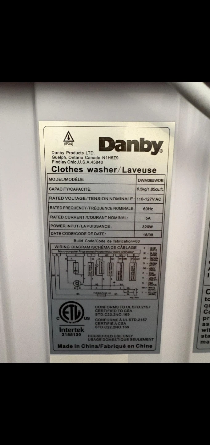Danby portable clothes washer/laveuse. Model DWM065WDB with a 6.5kg/1.85cu.ft capacity. It's white and runs on 110-127V AC power. Date of fabrication is 18/08.