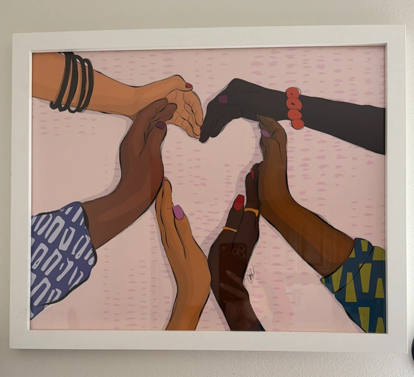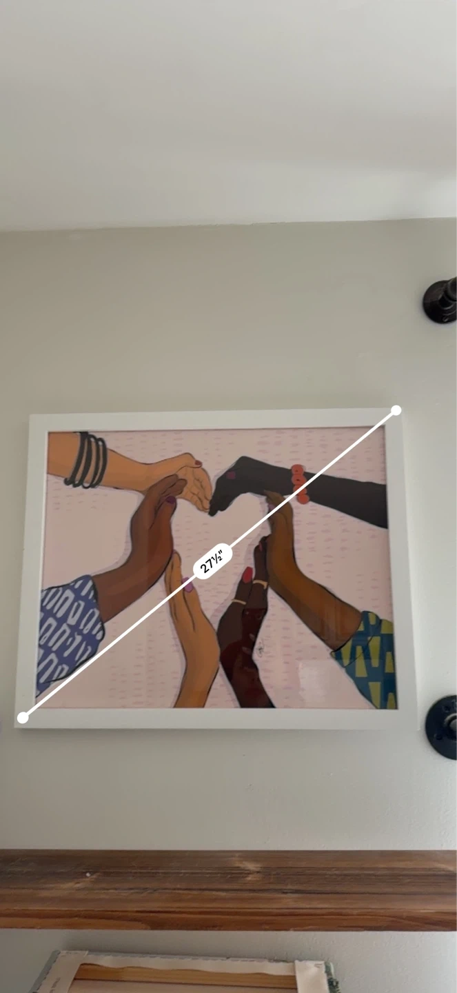 This framed art print displays a collection of diverse hands coming together to form a heart shape. The print is housed in a white frame. The artwork measures 27.5 inches diagonally. It's a beautiful piece celebrating unity and connection!