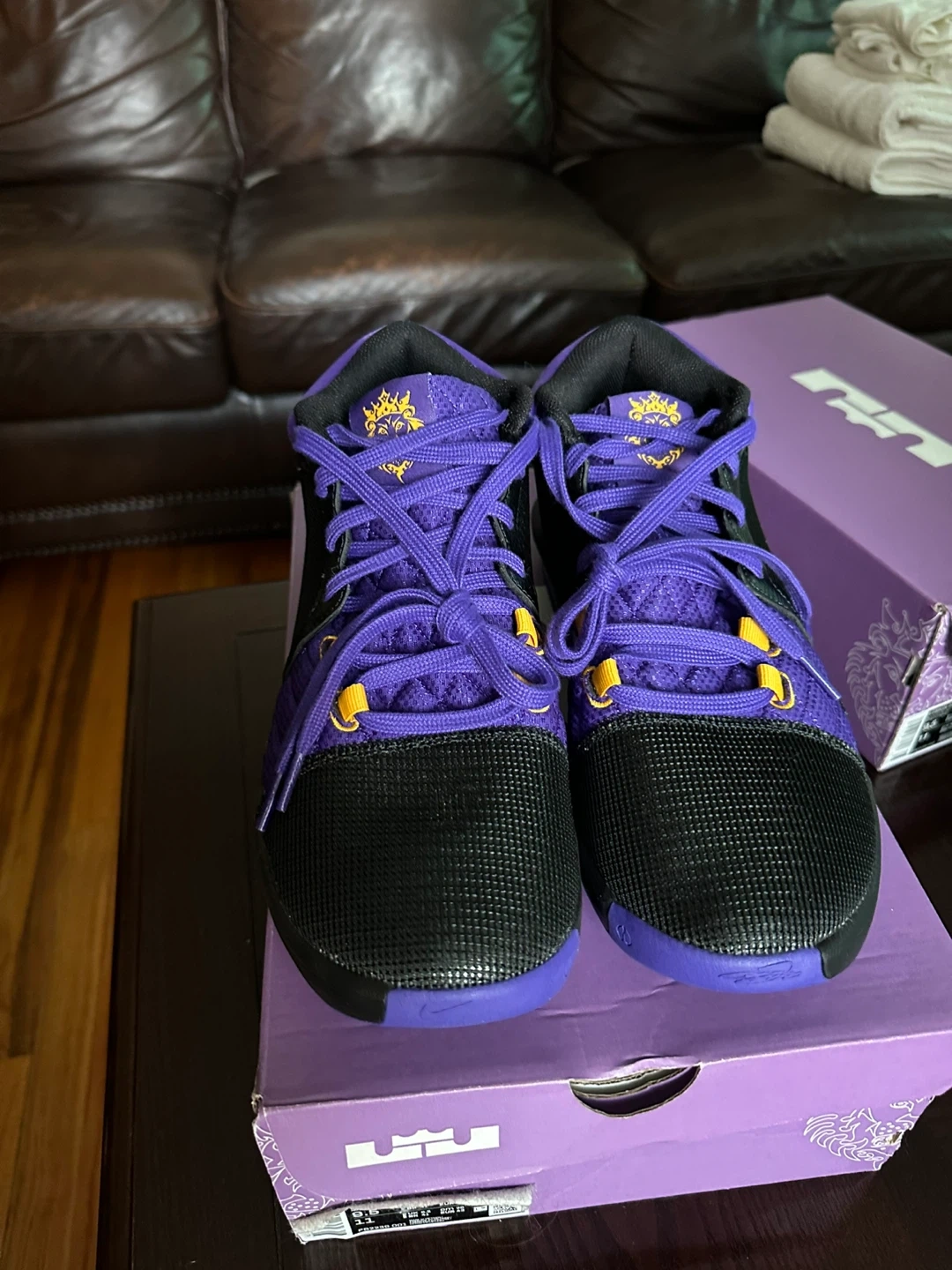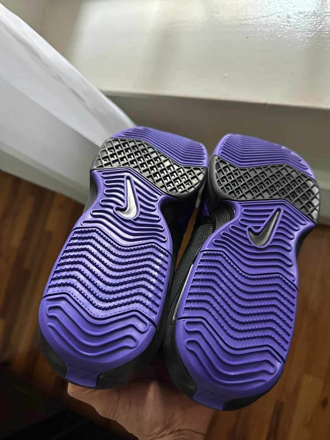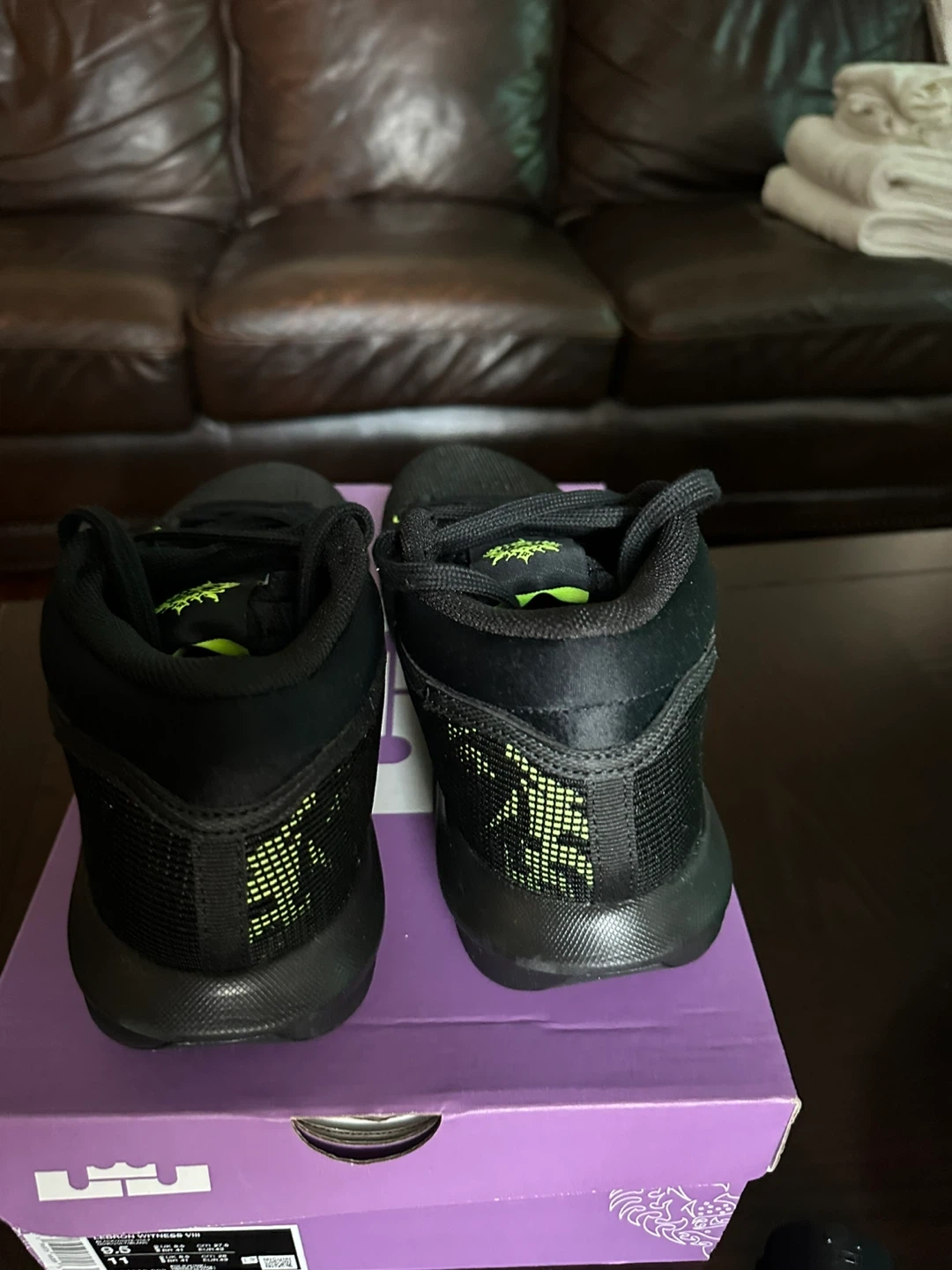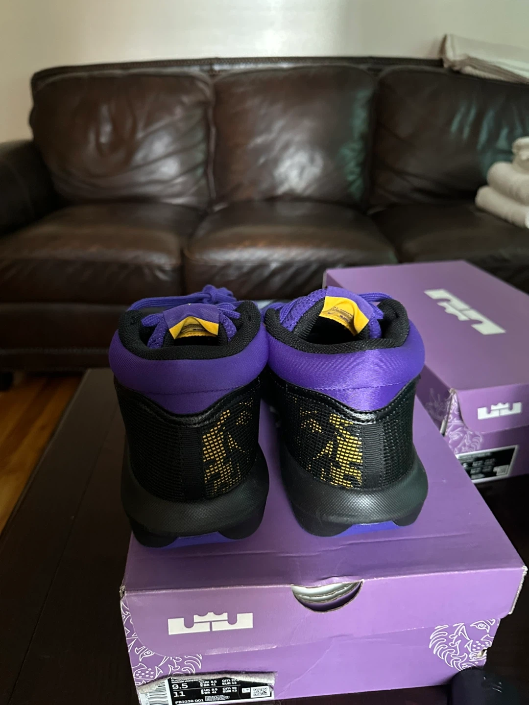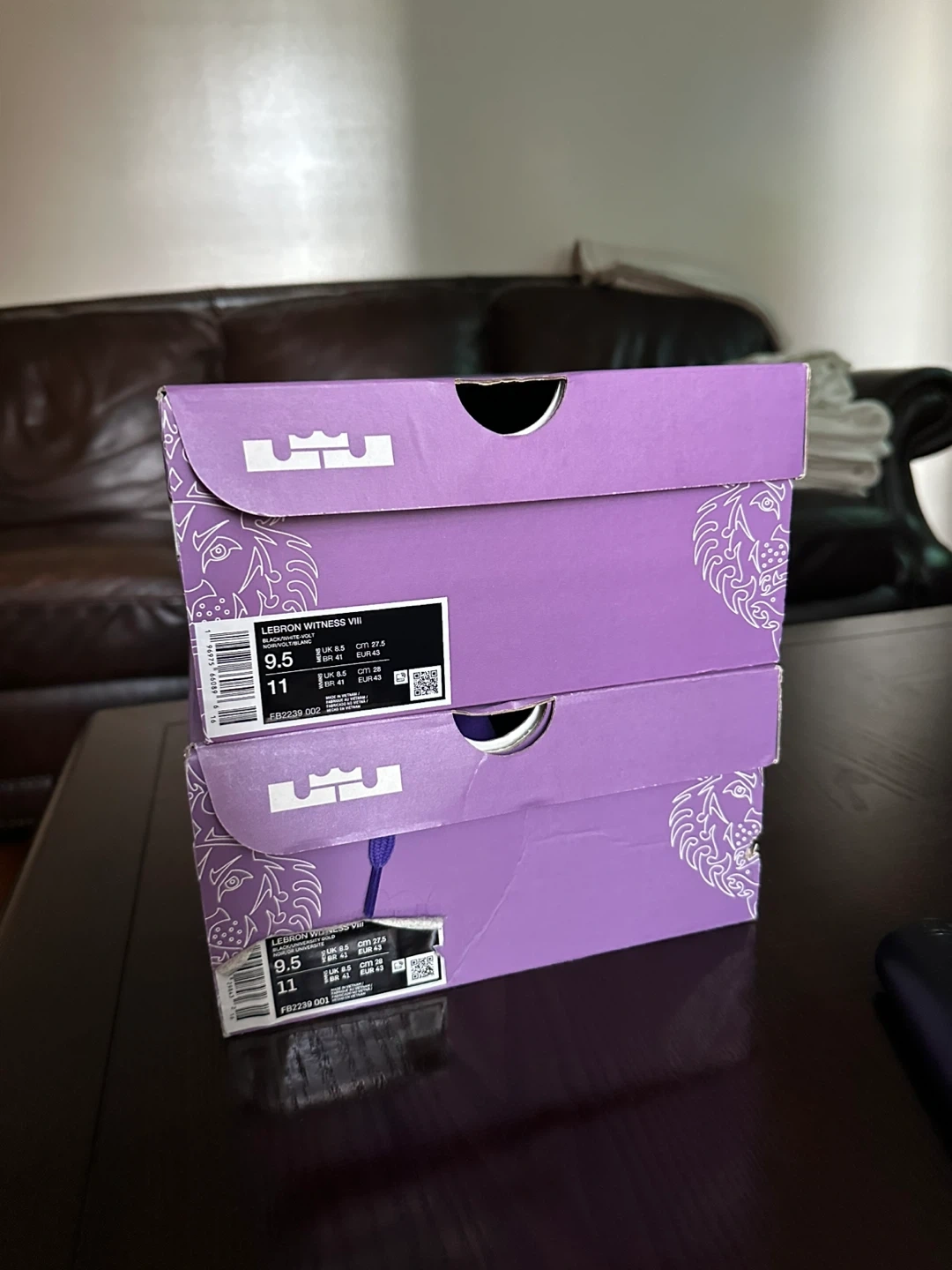 These Nike LeBron Witness VII basketball shoes come in a purple and black colorway. They are a size 9.5 US Men's. The shoes include the original box. They're designed for performance on the court! They are 2 pair