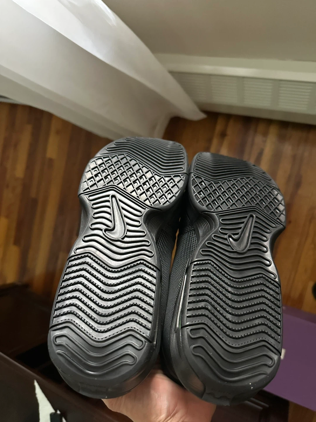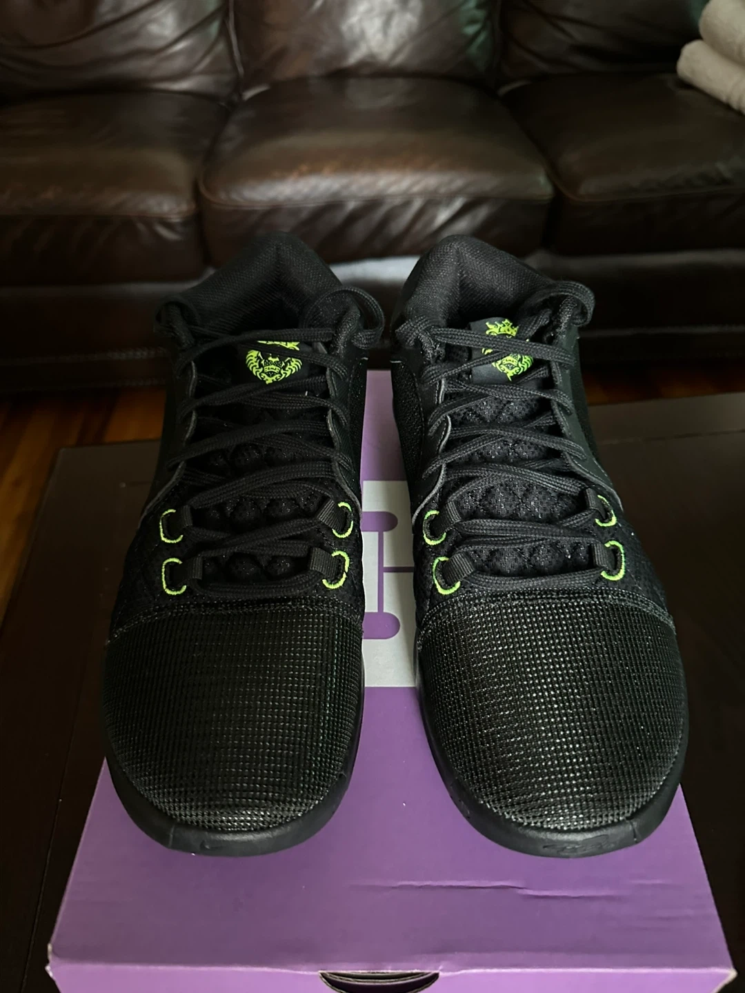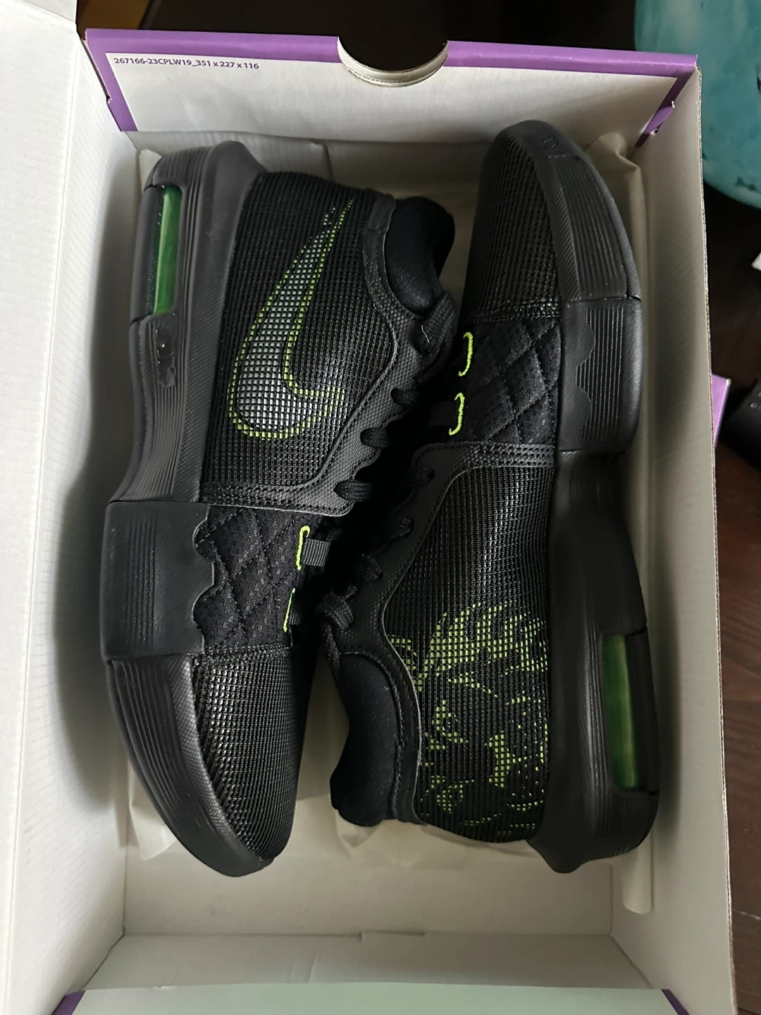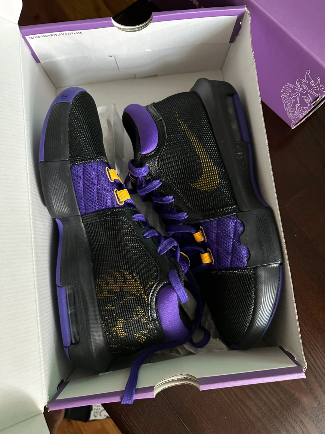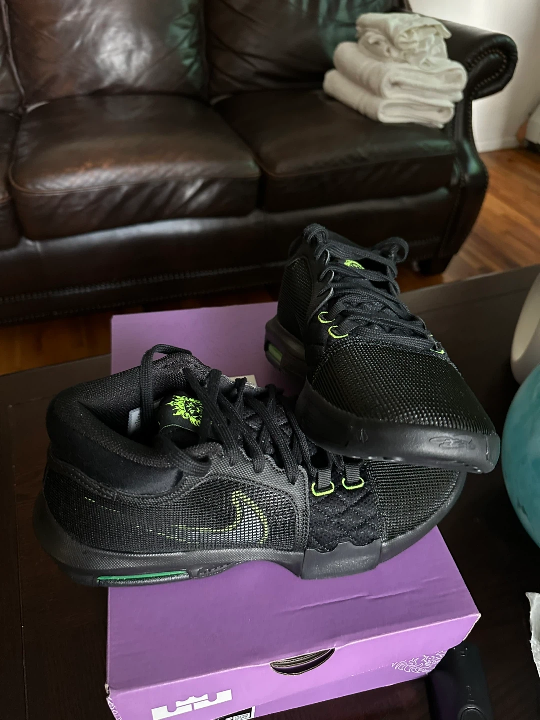 These Nike LeBron Witness VII basketball shoes come in a purple and black colorway. They are a size 9.5 US Men's. The shoes include the original box. They're designed for performance on the court! They are 2 pair