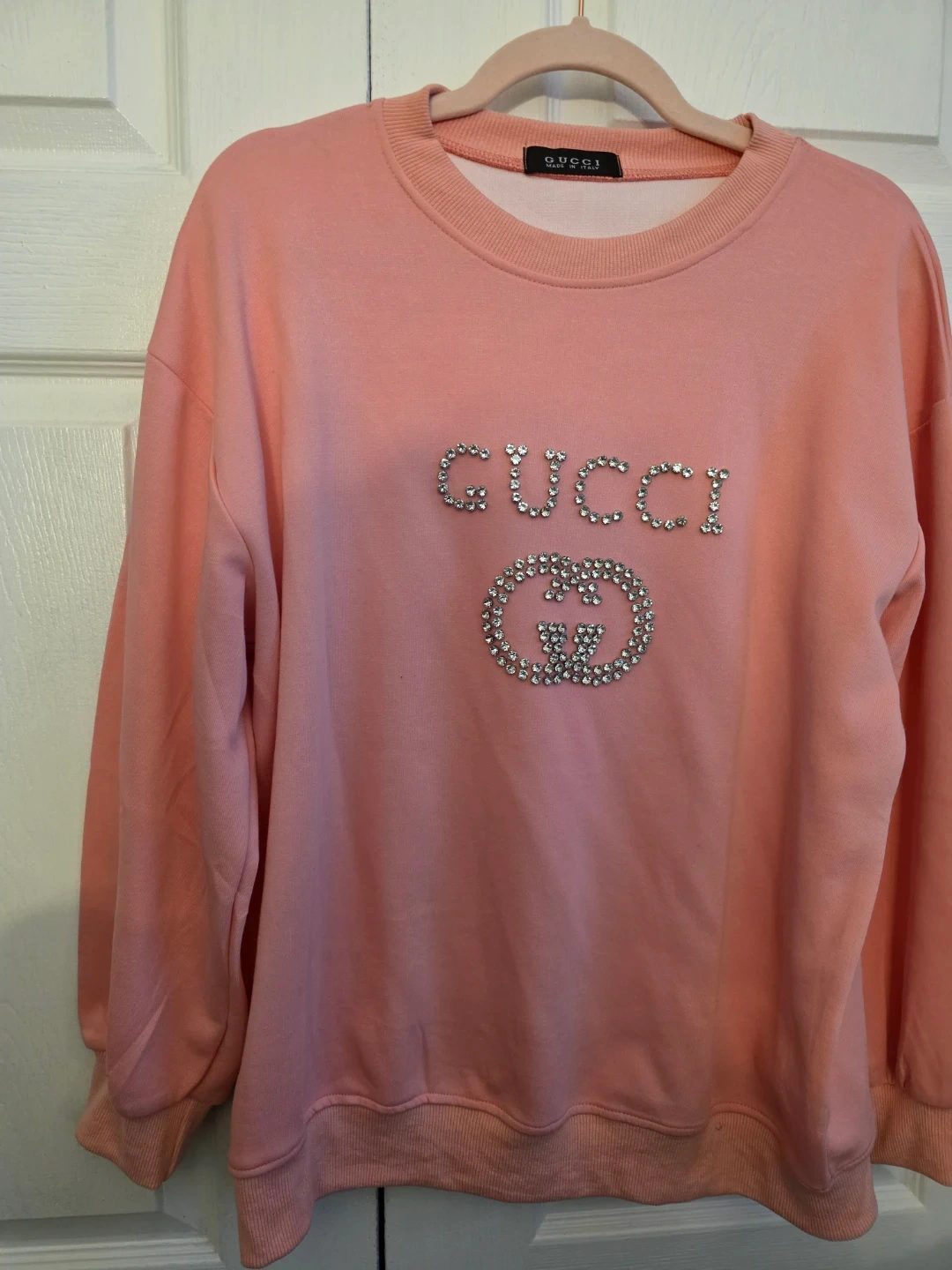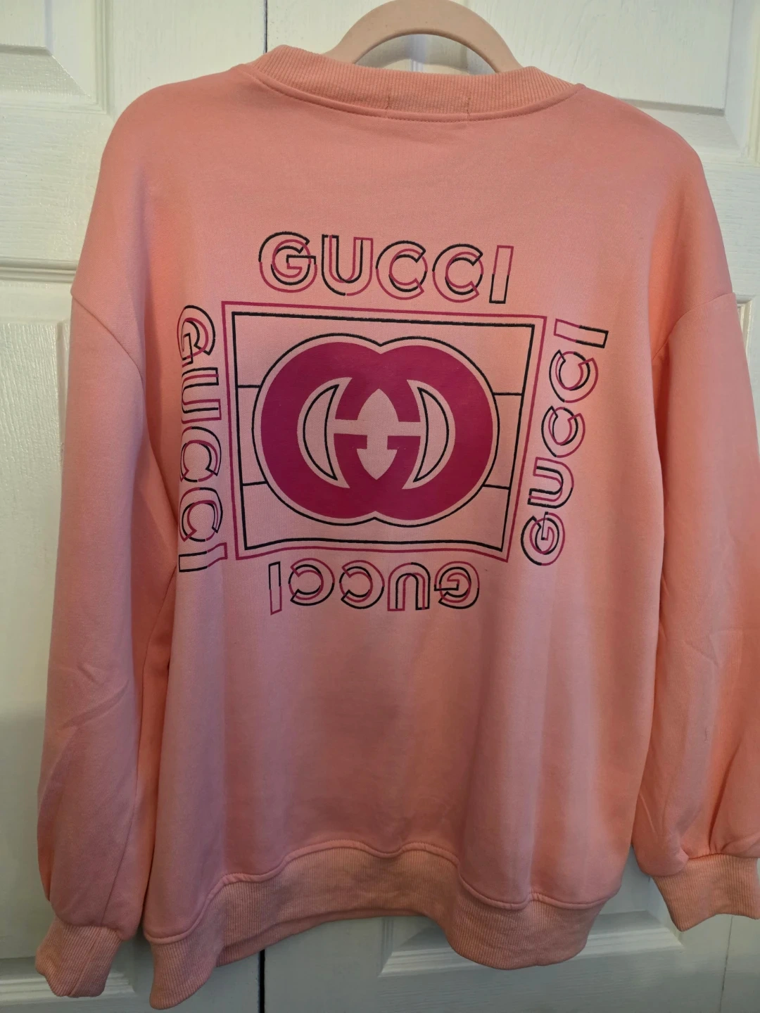 Selling a cute Gucci sweatshirt in a lovely pink color! It has a sparkly Gucci logo on the front and a larger graphic on the back. Perfect for adding a touch of designer style to your casual wardrobe