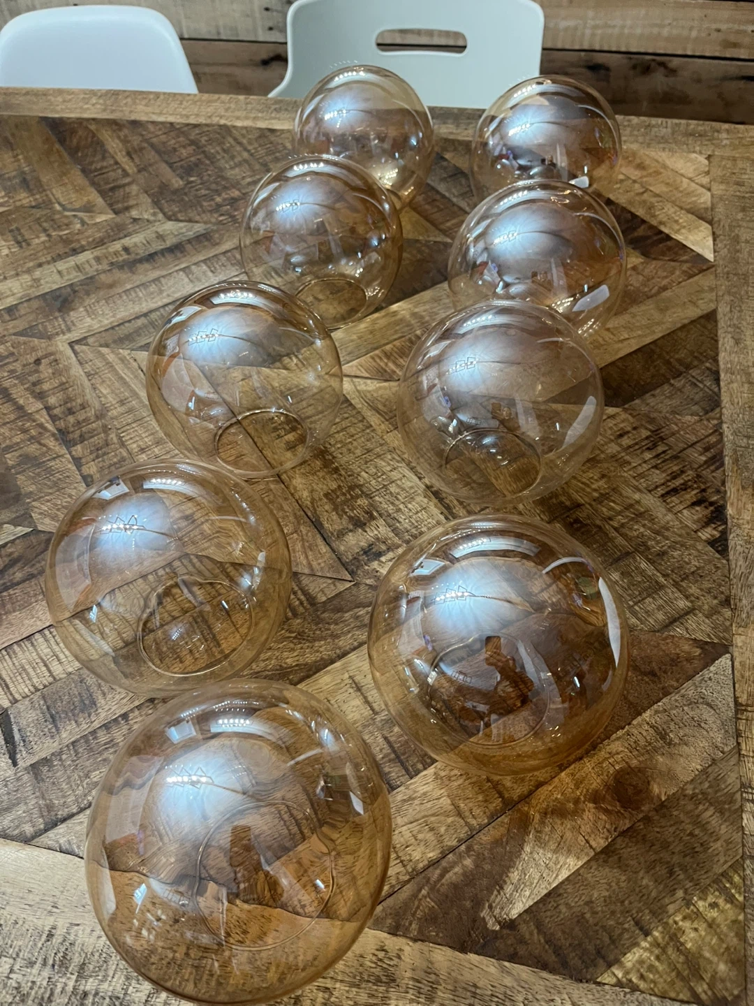 🏆rose gold glass globe light orbs / shades/decorative balls. Please refer to pics for measurements. 9 small rose gold. Perfect for a statement light fixture or DIY project vase with macrame, garden globe with lights or as decorative balls in garden, or table center pieces.