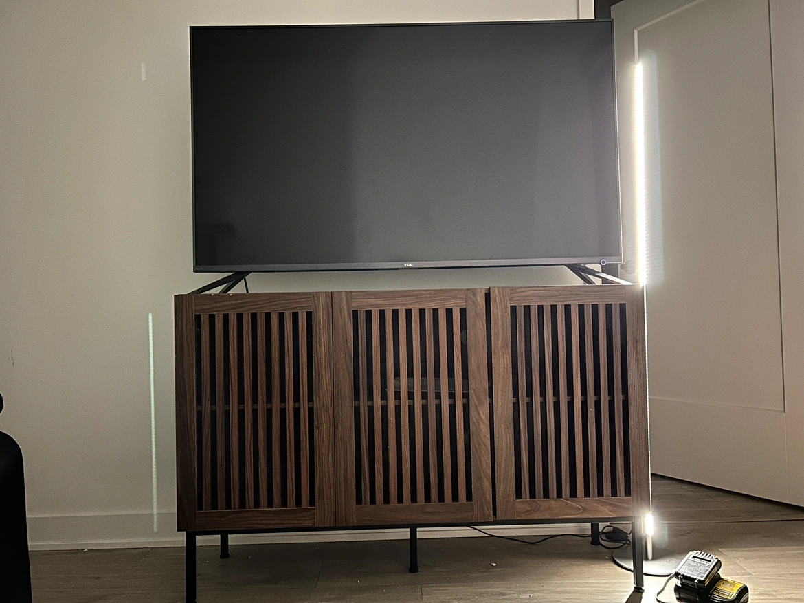 made from oakwood and features three doors, built-in shelves and black legs. Only selling because it’s too small for my TV.