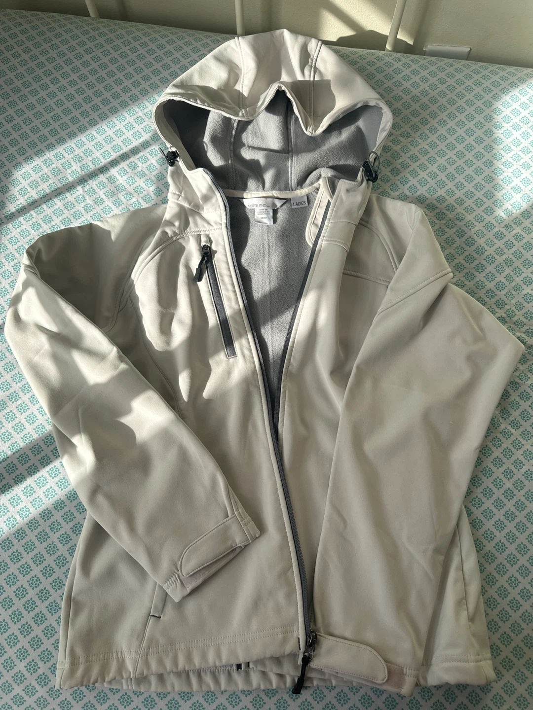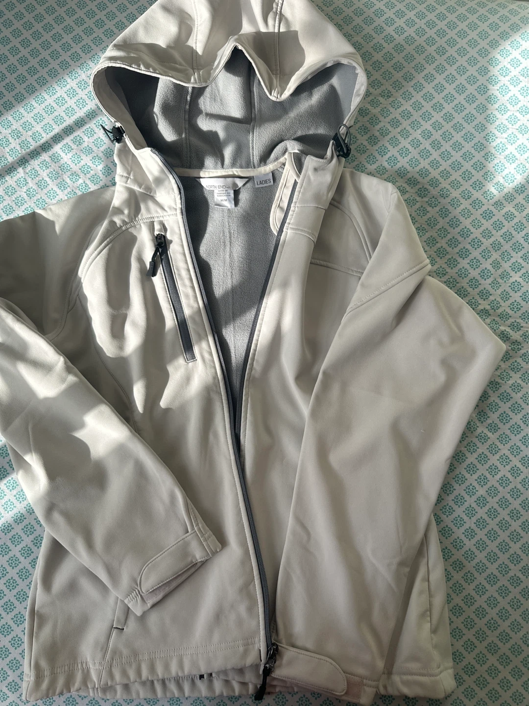 A light grey ladies softshell jacket with a hood. It's made of a breathable and waterproof material. Features include a full zip front, zippered pockets, and adjustable cuffs.