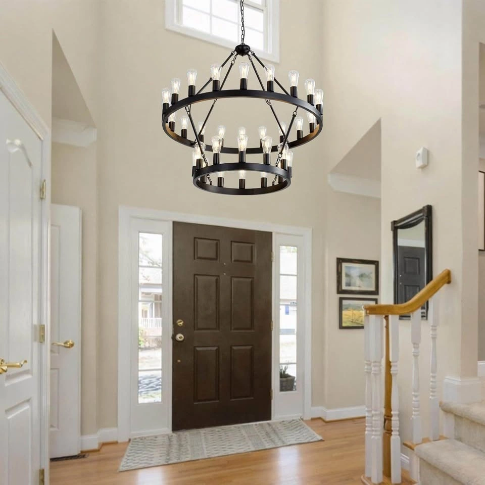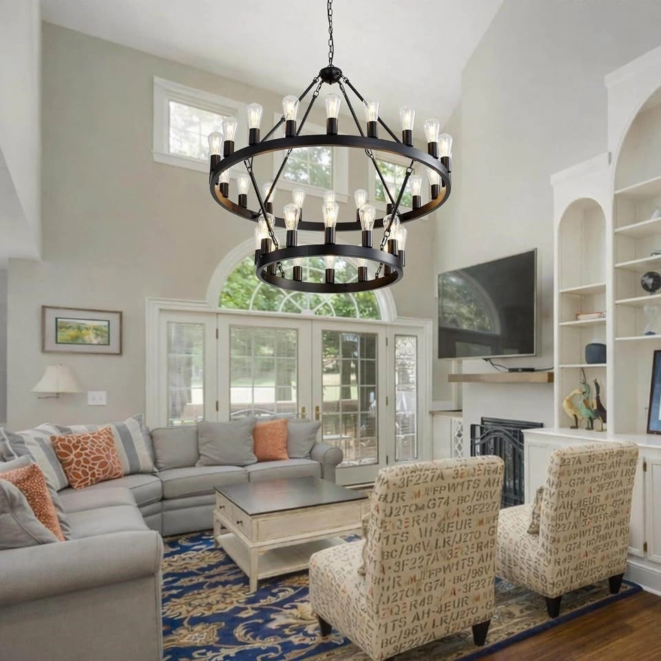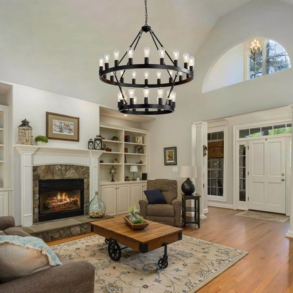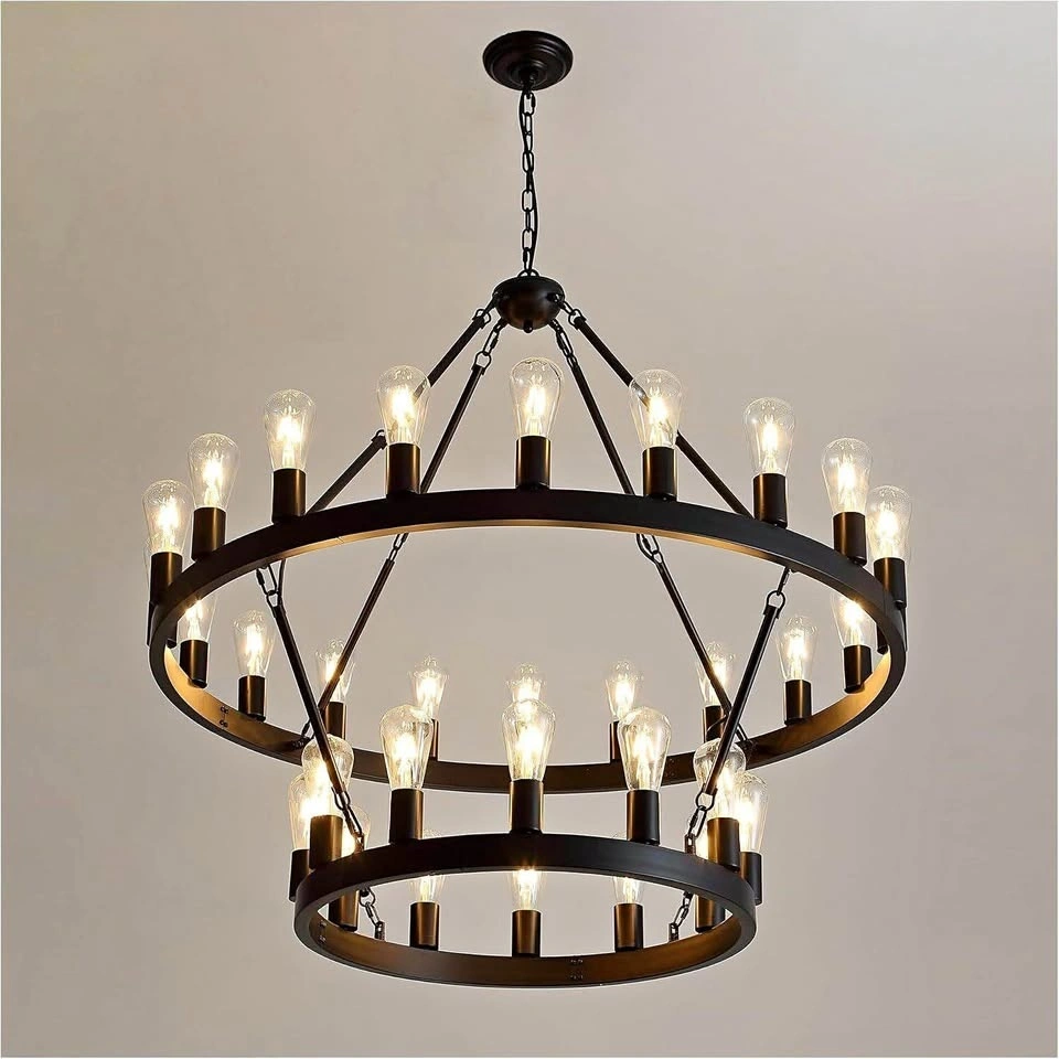 Classic Design & Farmhouse Style: This wagon wheel chandelier features a high-quality round metal frame with a smooth painted black finish. Simple in form yet visually striking, the open circular design is supported by sturdy linking rods, creating a timeless farmhouse style that blends rustic charm with modern elegance. A perfect centerpiece for dining rooms, living rooms, foyers, and entryways. Dimensions & Adjustable Height: Overall Fixture: 40" diameter; Canopy: 5" diameter x 1" height; Adjustable Height: 44"-110". The chandelier includes three hanging chains measuring 40 inches, 20 inches, and 12 inches, allowing flexible height combinations to accommodate different ceiling heights. Compatible with flat, sloped, and vaulted ceilings, making it ideal for both standard and high-ceiling spaces. Light Source & Fully Dimmable: This round chandelier requires 32 E26 candelabra base bulbs (bulbs not included), compatible with LED, incandescent, CFL, and halogen bulbs (maximum 20W per bulb). Fully dimmable when used with dimmable bulbs and a compatible dimmer switch (switch not included), allowing you to customize brightness and create the ideal atmosphere. Easy to Assemble & Install: The farmhouse pendant light fixture is pre-wired and includes mounting hardware along with a detailed manual for easy assembly and installation. Designed for dining rooms, kitchen areas, living rooms, staircases, foyers, and entryways. UL Listed: This chandelier is UL Listed, ensuring safety, performance, and reliability.