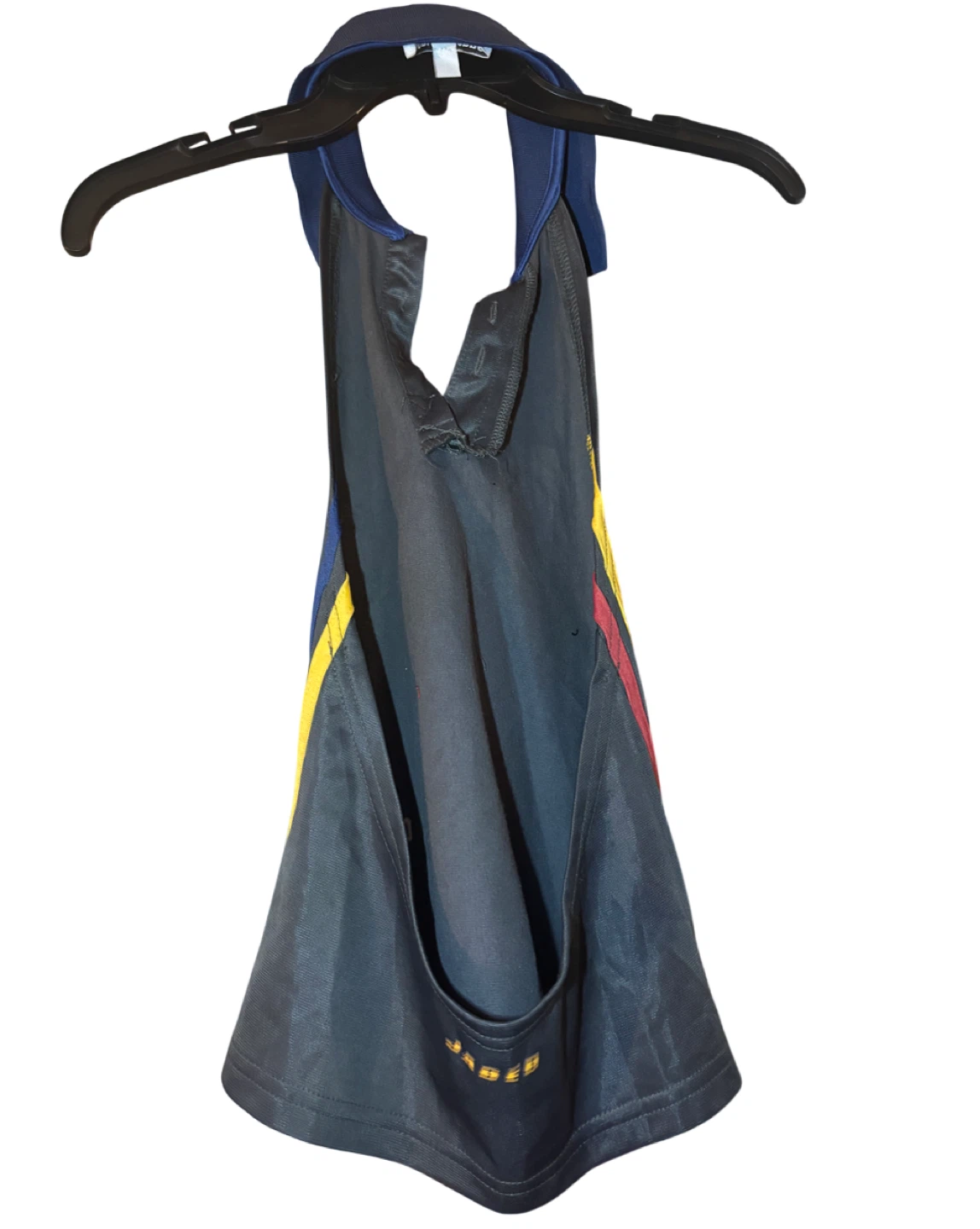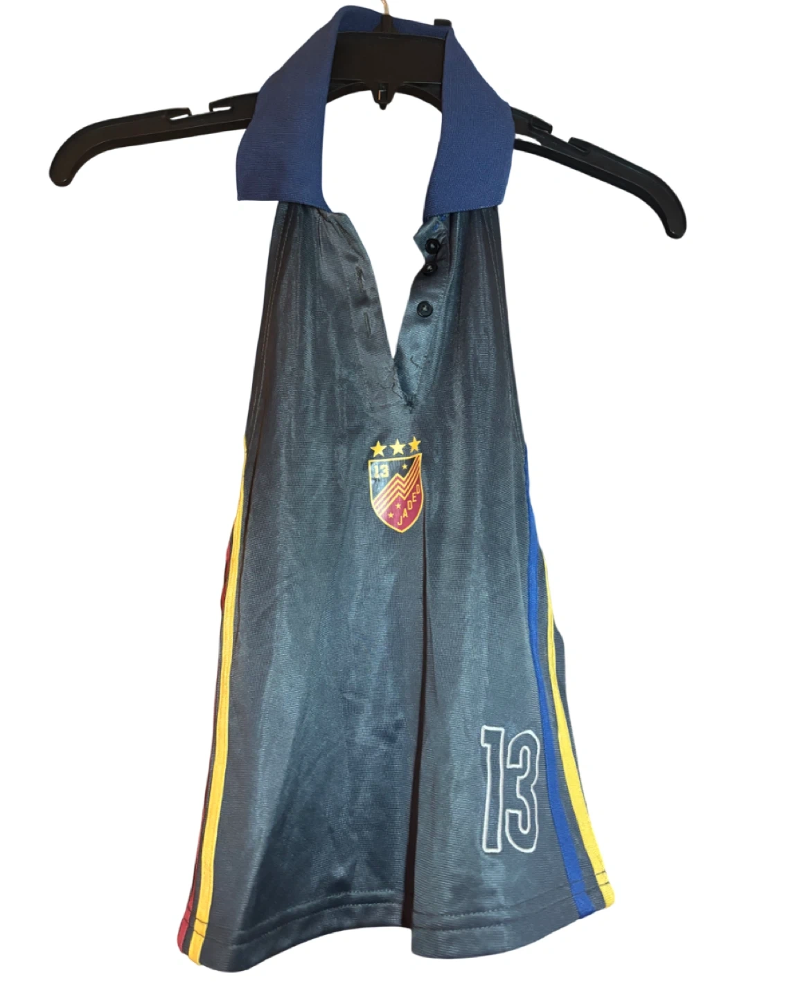 This is a Jaden London halter top tank. It features sporty stripes on the sides and the number 13 printed on the front. Slight distress pictured can be sewed back.