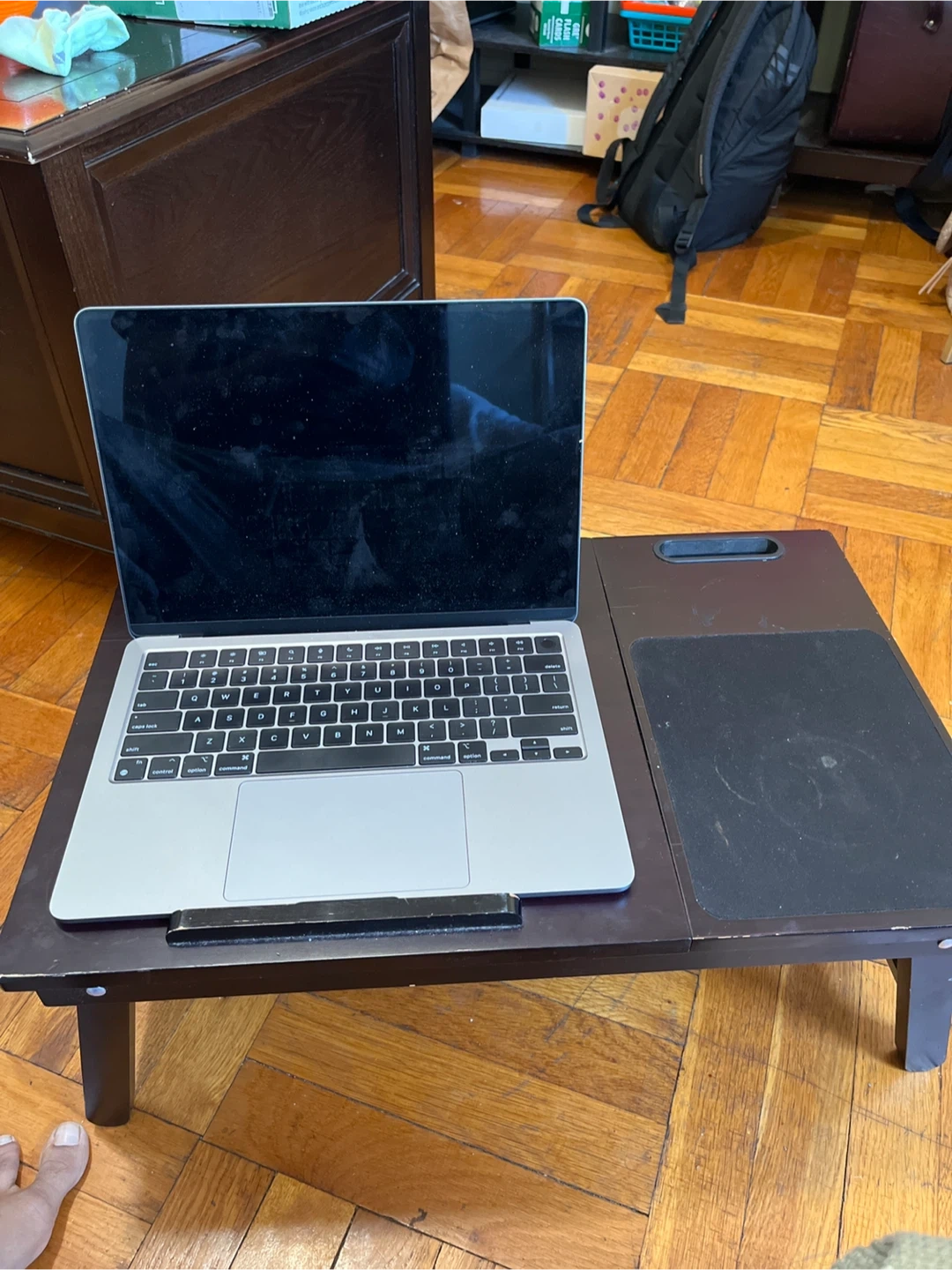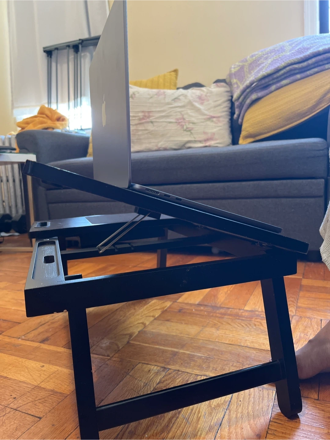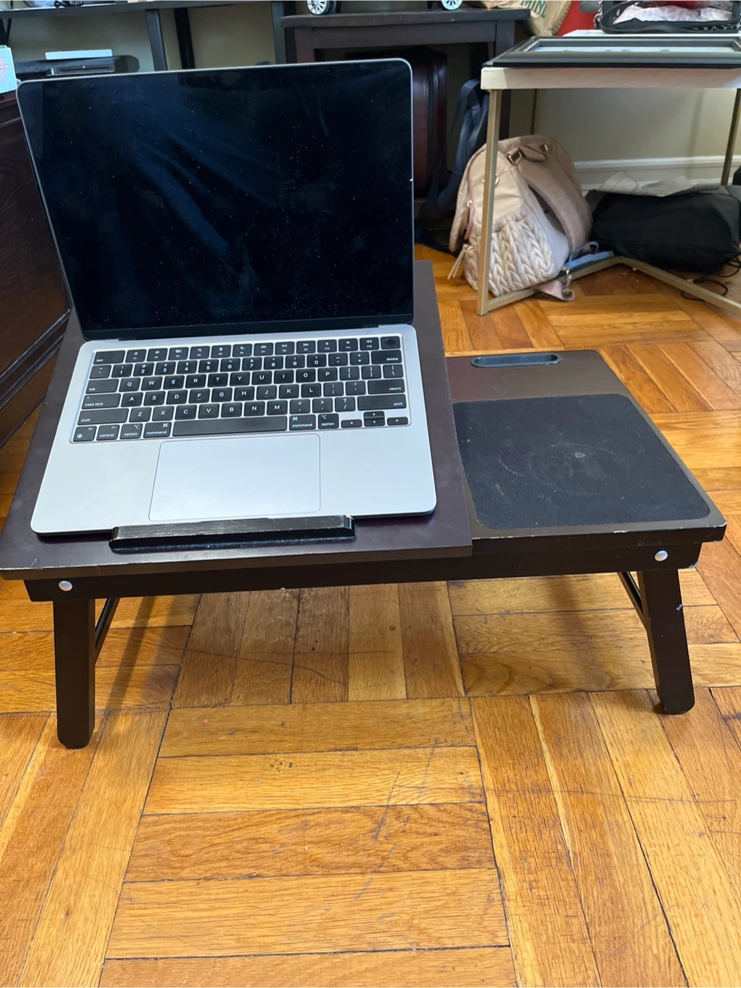 This is a wooden laptop tray with an adjustable easel. It's great for using your laptop in bed or on the couch. The tray is made of wood and has a dark finish.