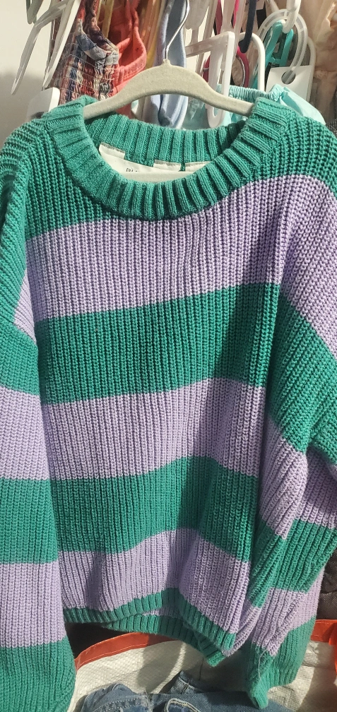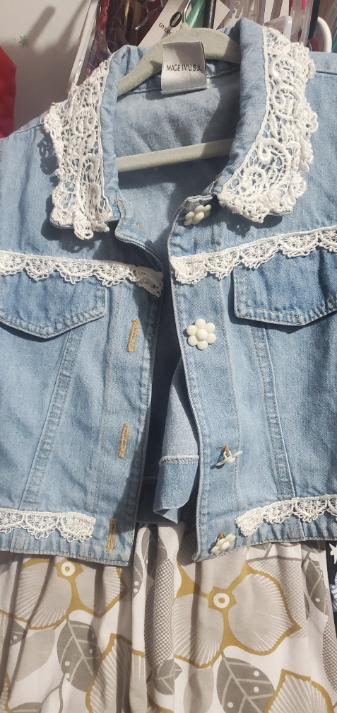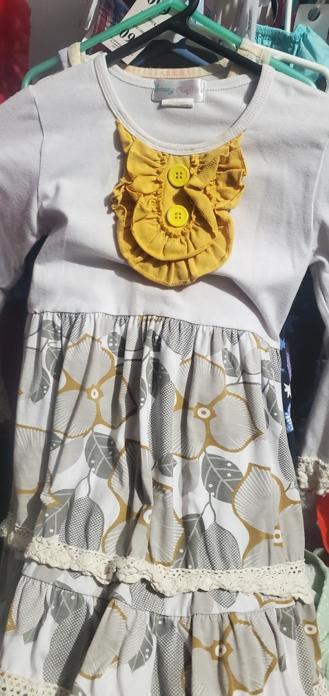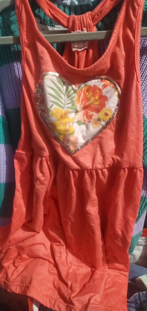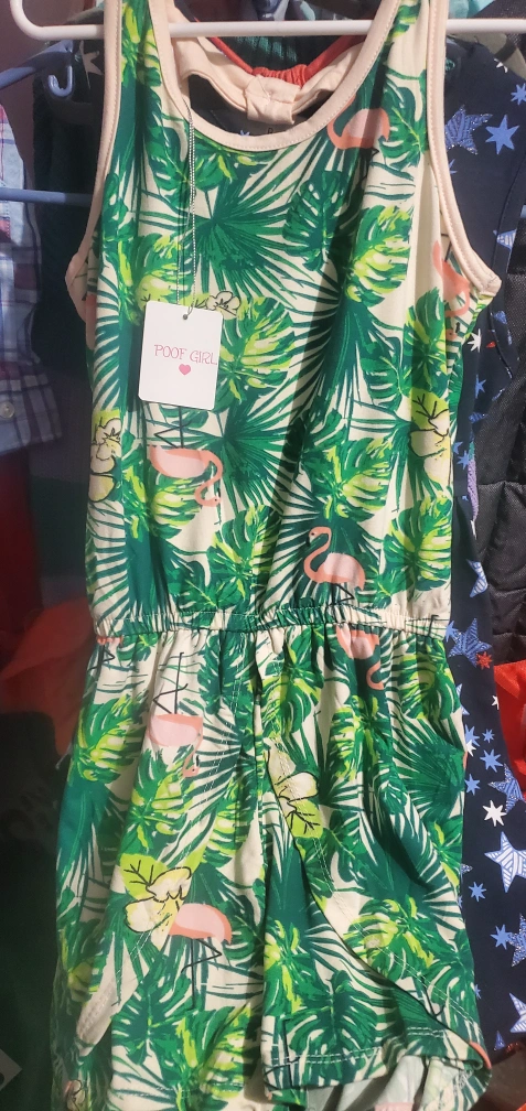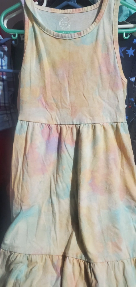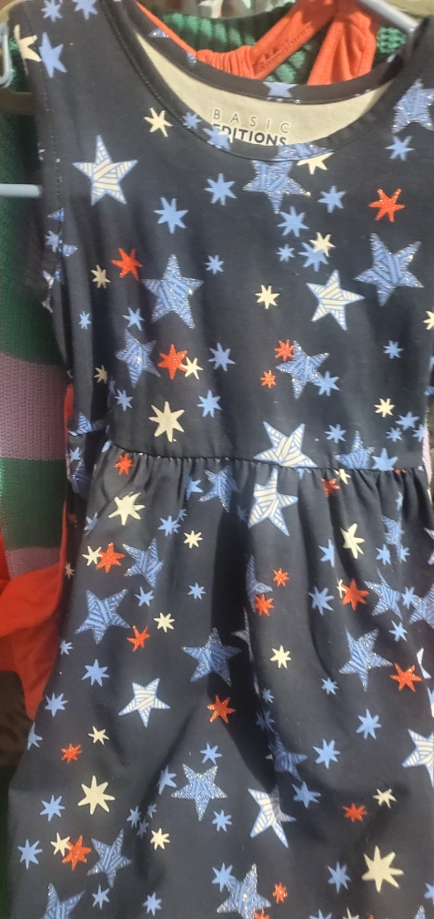 Cute navy blue dress with a scattered star print in red, white, and blue. It's sleeveless with an elastic waist. Cotton blend fabric.