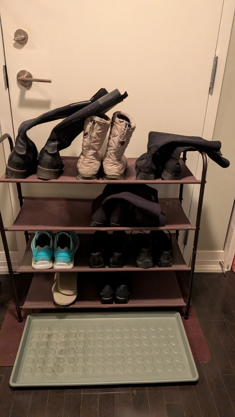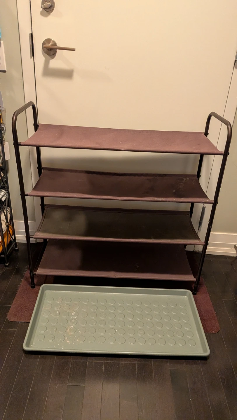 Keep your entryway tidy with this 4-tier shoe rack. It includes a boot tray to catch dirt and water. Plenty of space for boots, sneakers, and more!