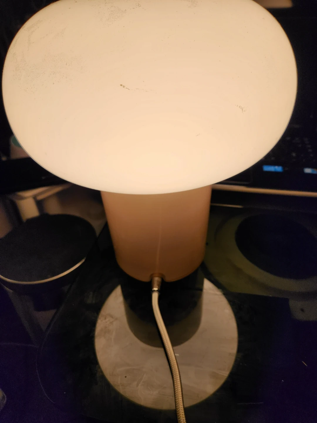 A stylish mushroom-shaped table lamp with a soft glow. It has a peach-coloured base and a white diffuser. Perfect for adding ambient light to any room!