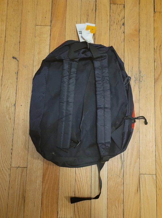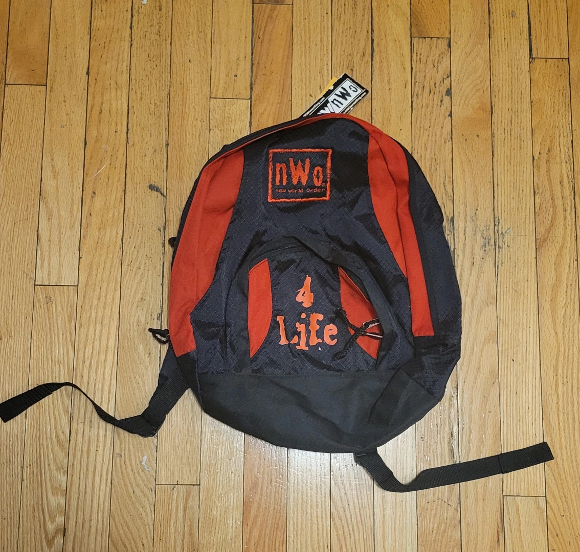 This is an NWO backpack. It is black and red and has the NWO logo on the front. It also says "4 Life" on the front.