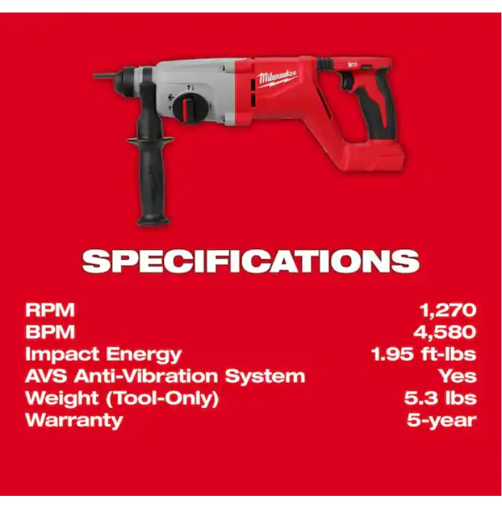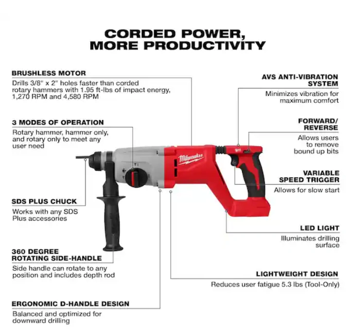 Rotary hammer drill with an ergonomic D-handle design. Includes a depth rod and side handle. Features a brushless motor with three modes of operation. With this tool, you can make home improvement feel a little easier.