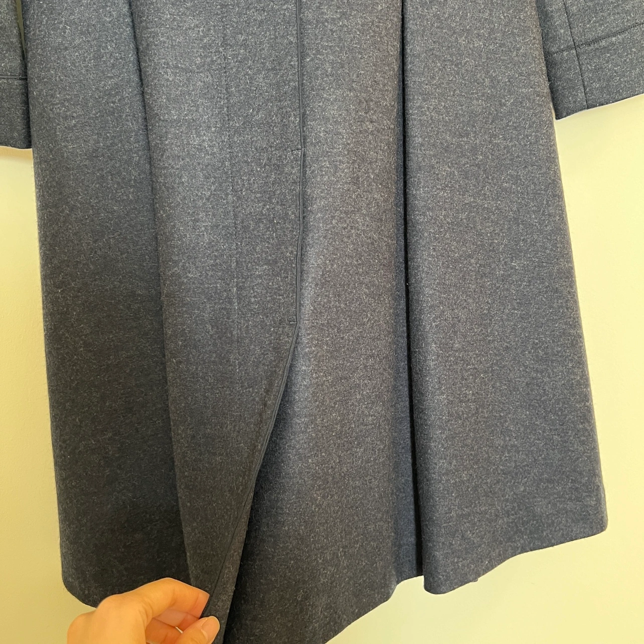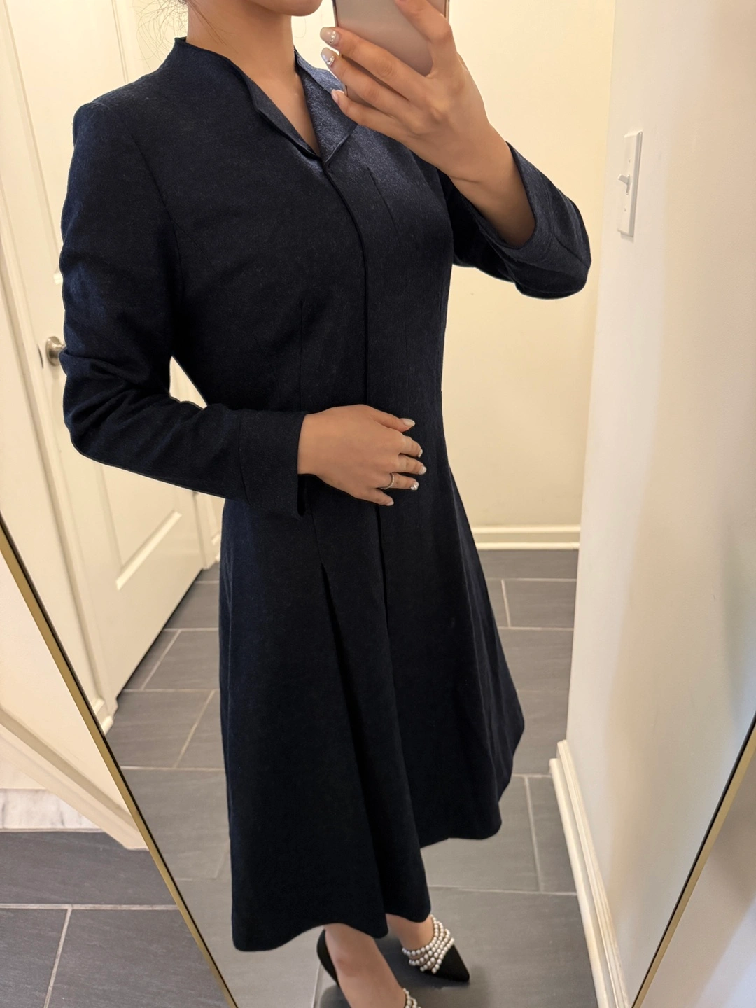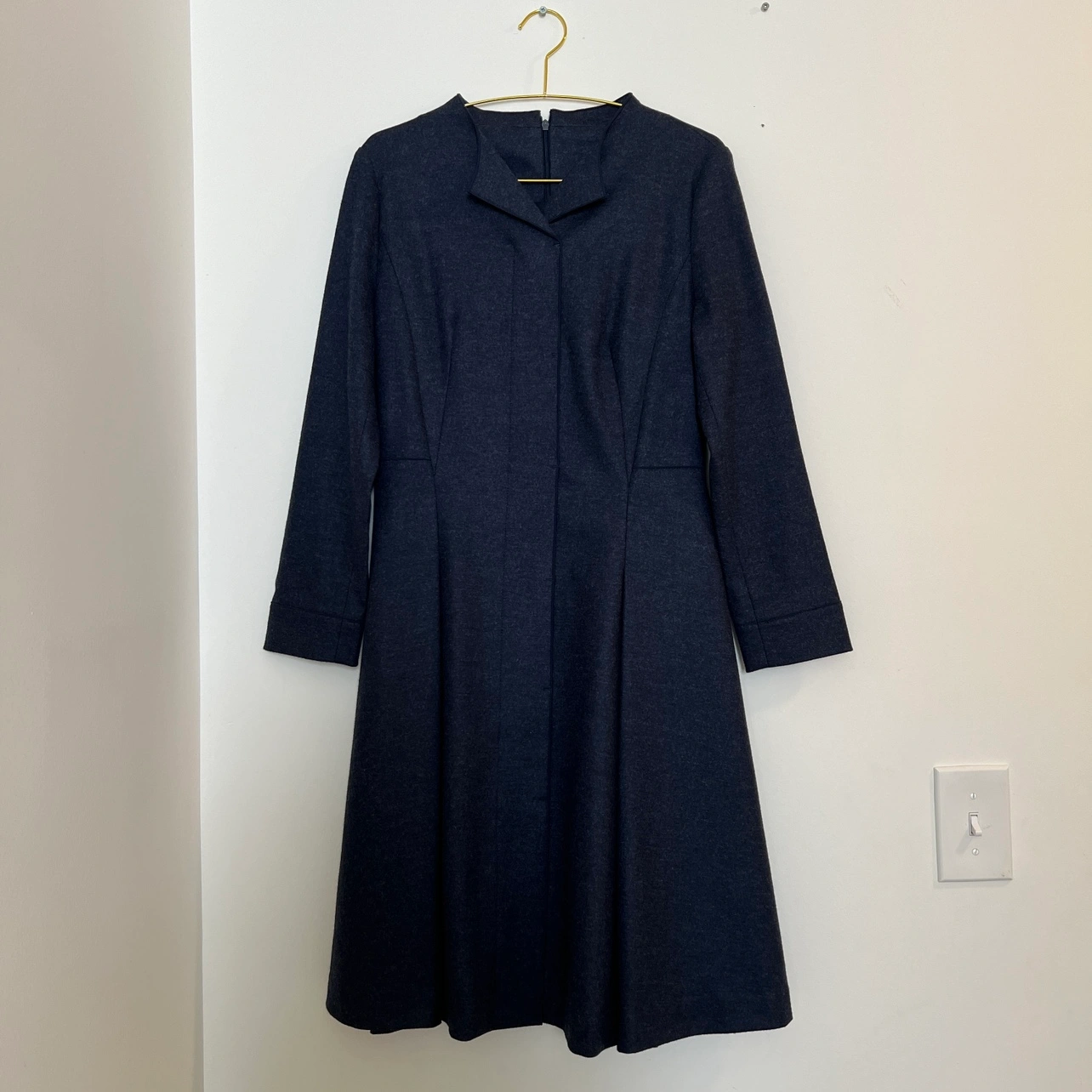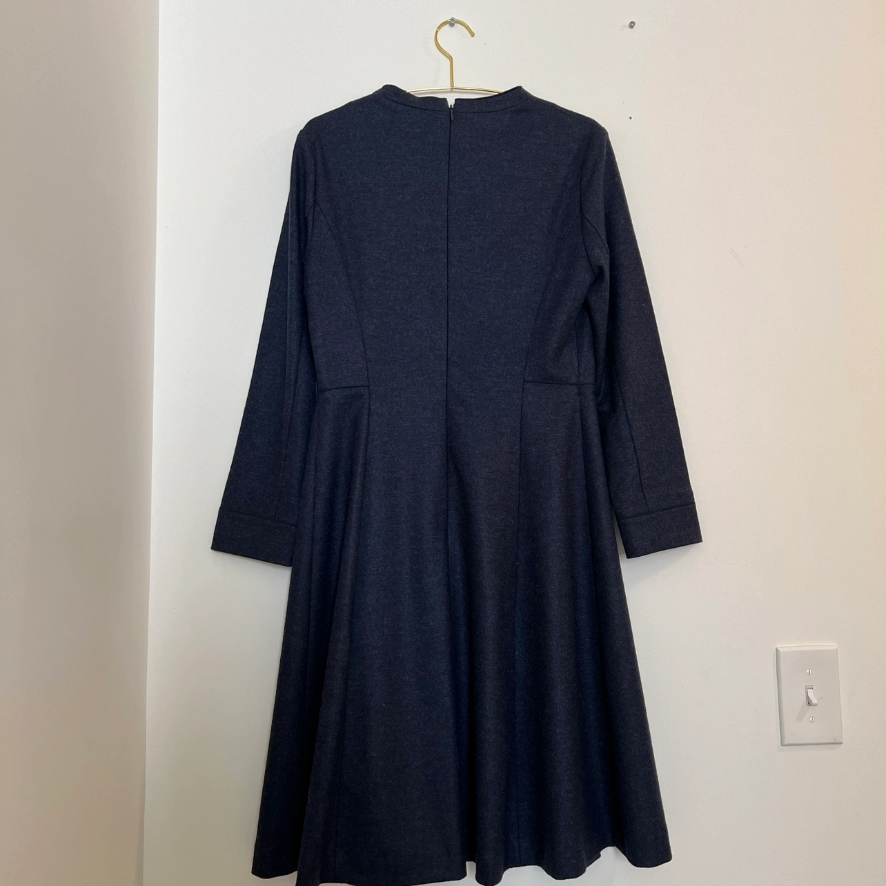 Elegant A-line wool dress with long sleeves and a knee-length silhouette. Features a flattering V-neck and a convenient zipper closure at the back. Made from 100% high-quality wool, ensuring both comfort and durability. NWOT, never worn, and in perfect condition—this is a timeless piece you’ll love in your wardrobe! If you wear a size 2, it offers a relaxed fit, and if you wear a size 4, it provides a true-to-size fit. • Dress Shoulder: 15.4in Bust: 17.3in Sleeve Length: 22.4in Waist Size: 15in Hip Size: - Length: 39in