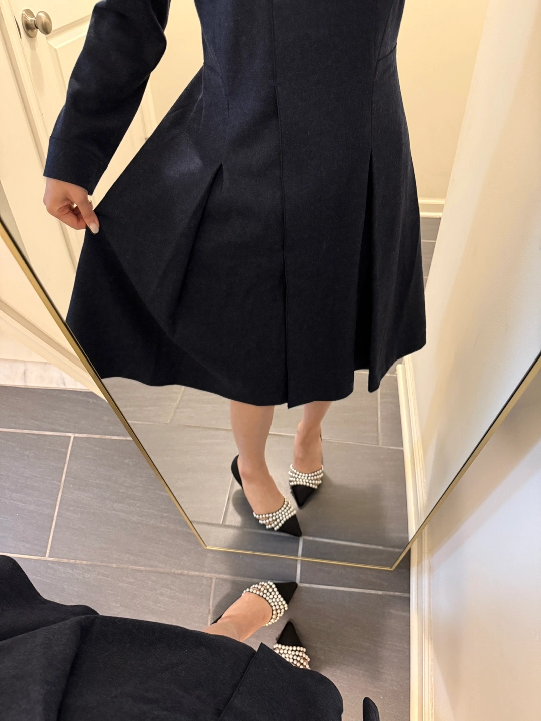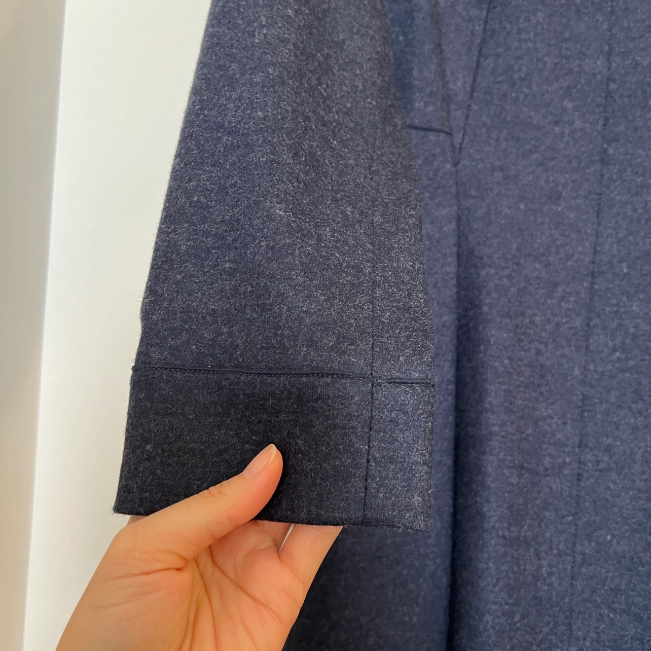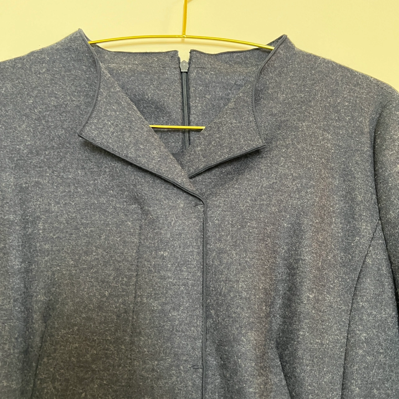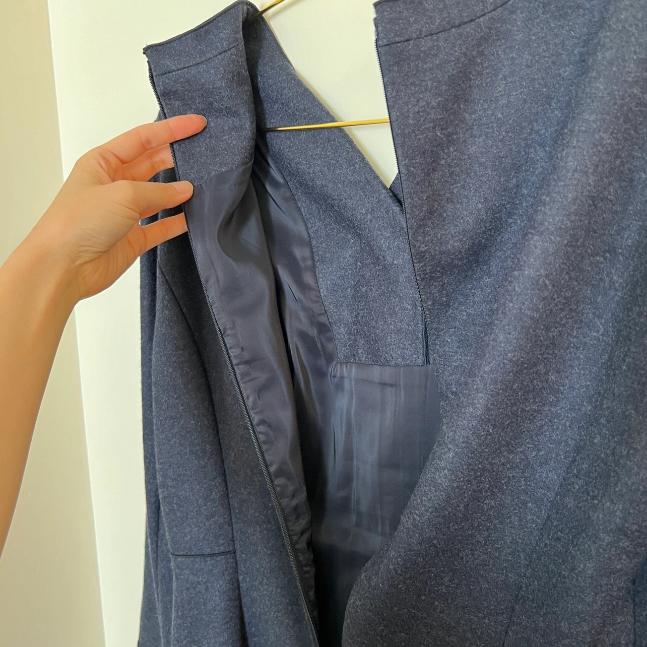 Elegant A-line wool dress with long sleeves and a knee-length silhouette. Features a flattering V-neck and a convenient zipper closure at the back. Made from 100% high-quality wool, ensuring both comfort and durability. NWOT, never worn, and in perfect condition—this is a timeless piece you’ll love in your wardrobe! If you wear a size 2, it offers a relaxed fit, and if you wear a size 4, it provides a true-to-size fit. • Dress Shoulder: 15.4in Bust: 17.3in Sleeve Length: 22.4in Waist Size: 15in Hip Size: - Length: 39in