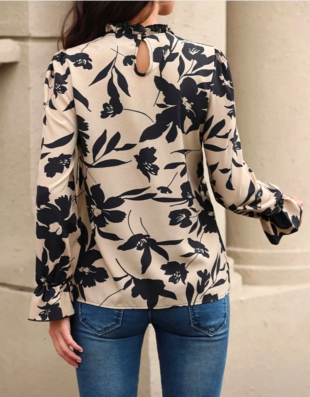 68Here's a cute floral print Ruffle Trim blouse with long sleeves! It's a size medium and made of 95% polyester and 5% elastane. Machine washable too Never Worn Cash only please.