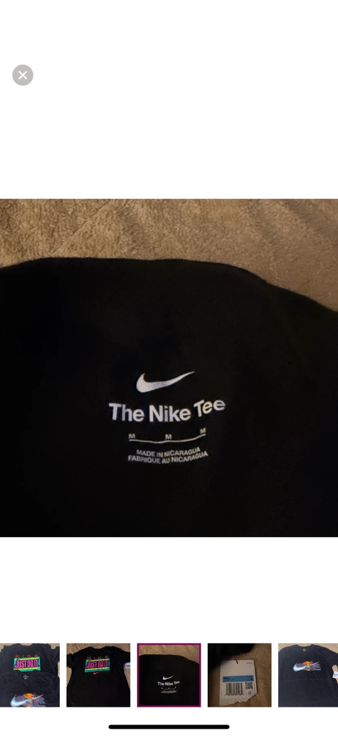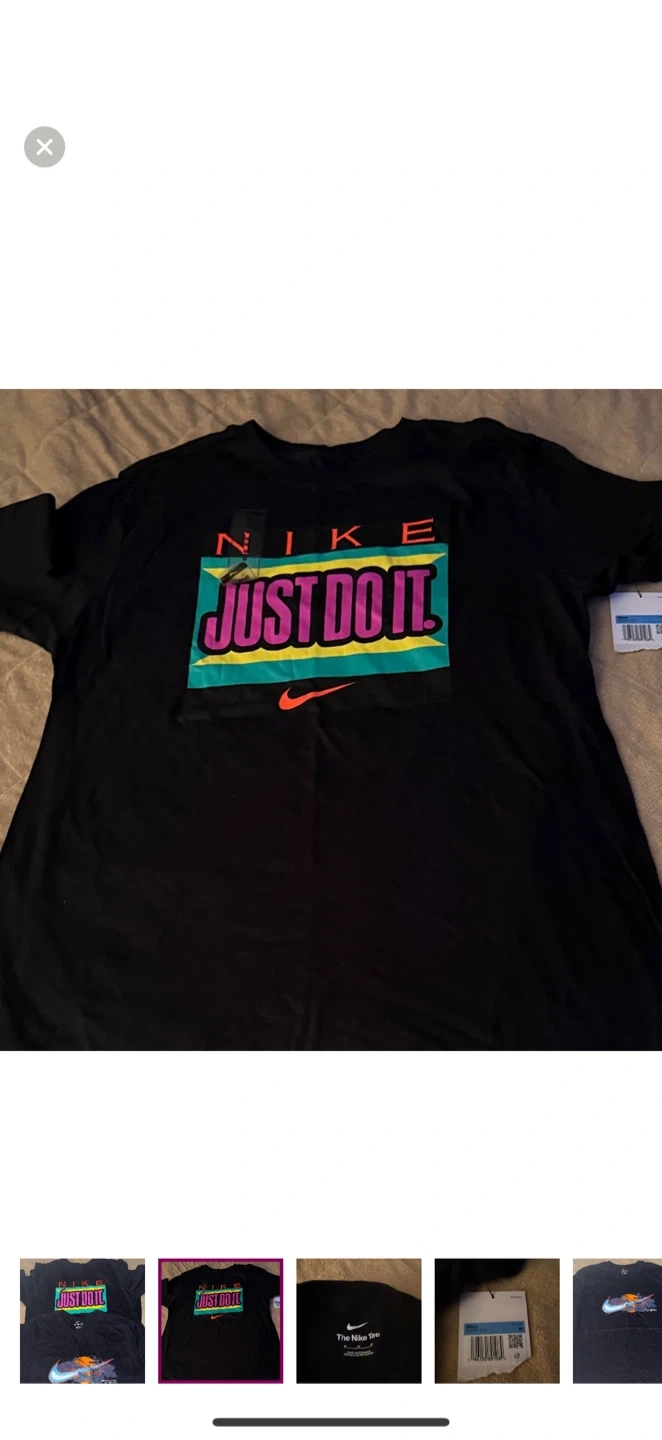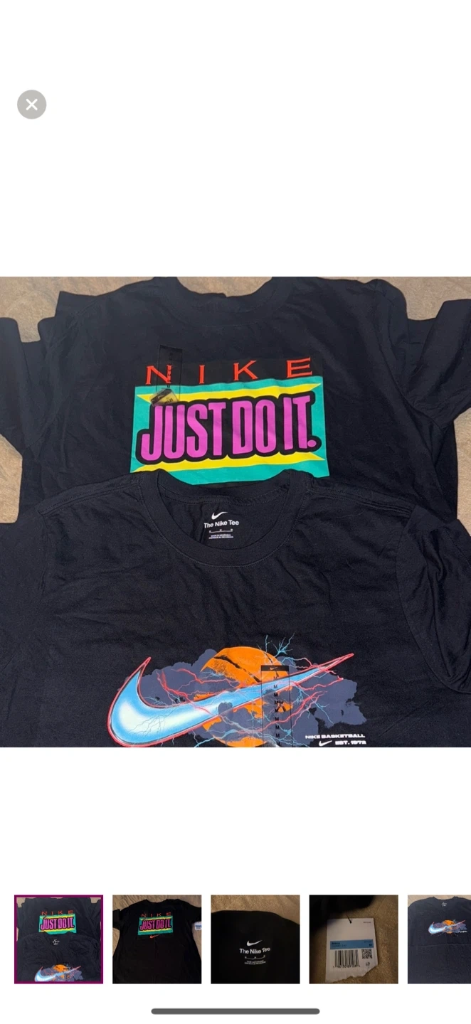 Selling a couple of Nike T-shirts, both size medium and in brand new. One is a black tee with a colorful graphic design, and the other features the classic "Just Do It" slogan. Perfect for casual wear or hitting the gym. $25 for both tops.