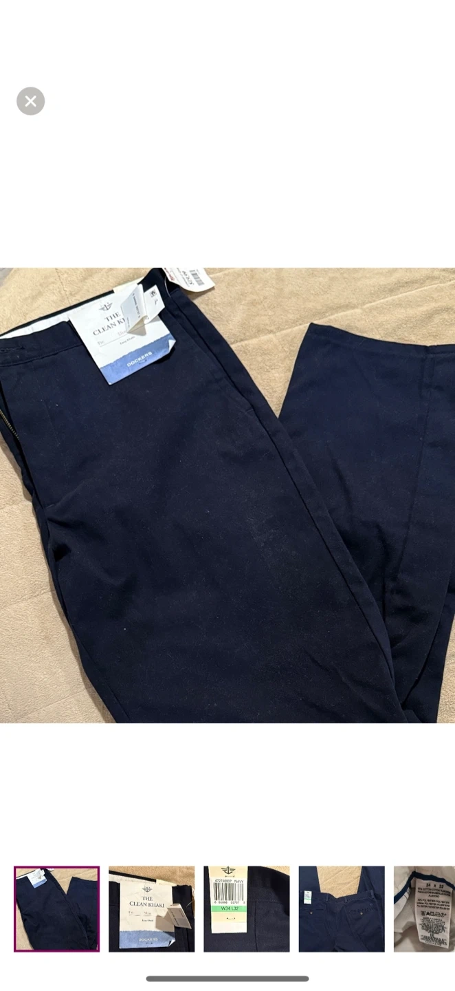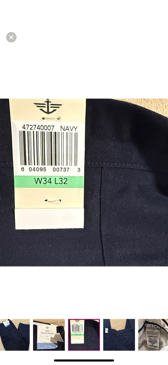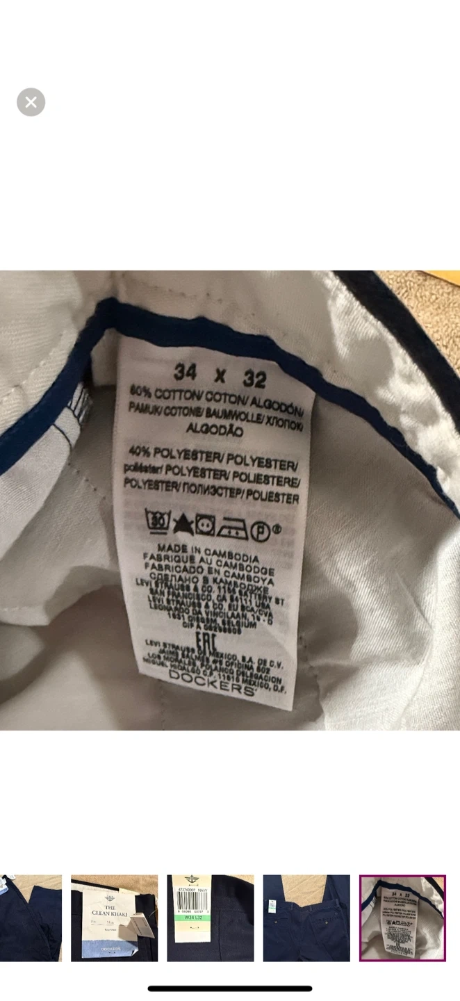 Here are some Dockers The Clean Khaki pants in size 34x32. They are a slim fit and in navy color. The material is 60% cotton and 40% polyester. Brand new. Navy