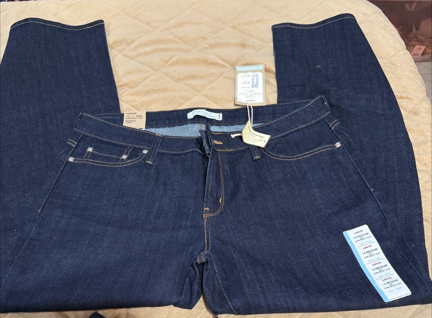 Selling a pair of Levi's 545 Low Boot Cut jeans in size 14 Medium. They are made from 99% cotton and 1% spandex. These jeans sit on the hips and have a slim fit for a lean look, with a boot cut leg opening. Perfect for a casual yet stylish outfit!