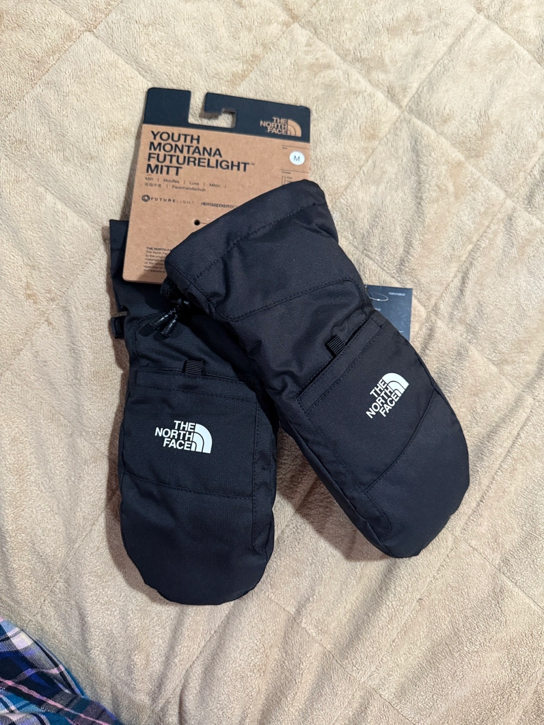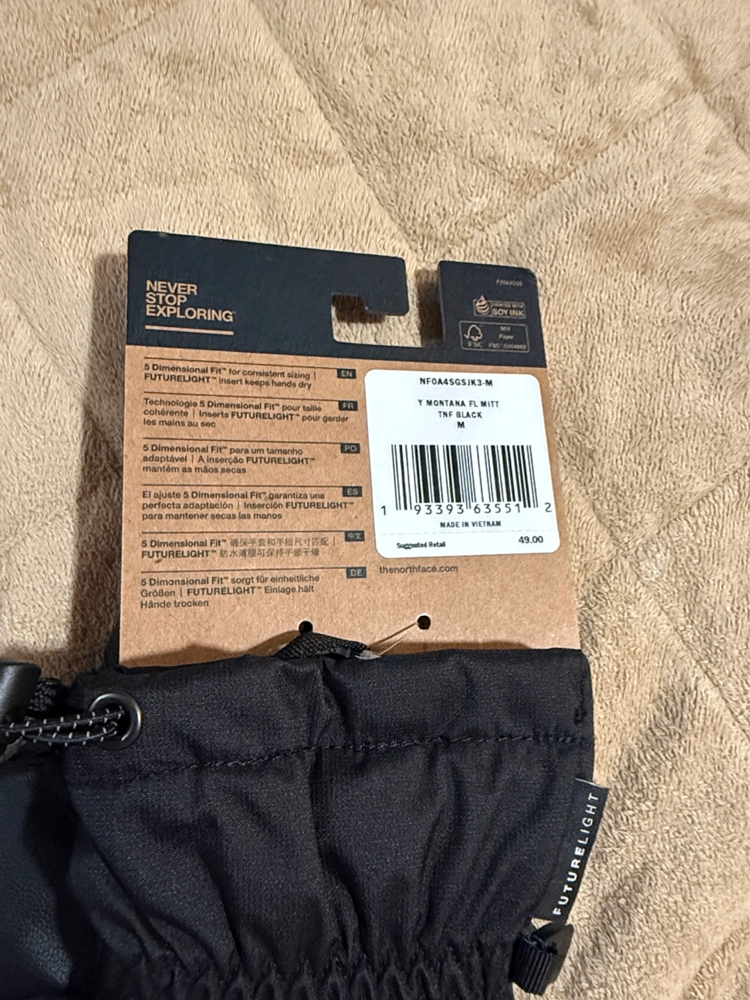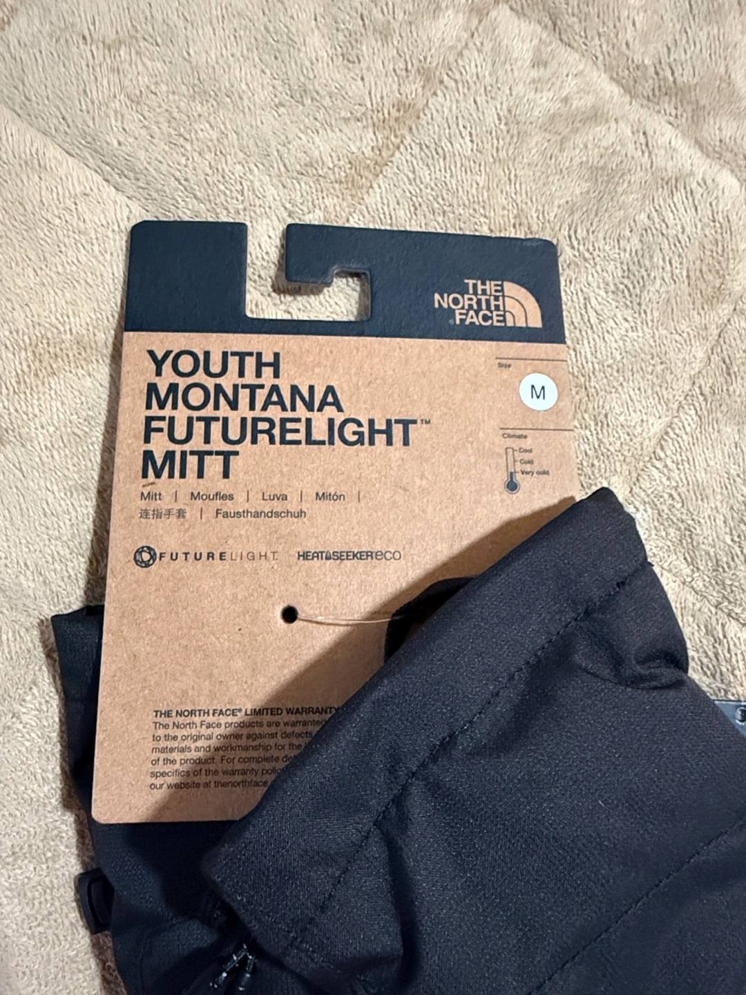 Selling a pair of The North Face Youth Montana FUTURELIGHT Mitts in size M. These mittens are black and designed to keep hands dry with 5 Dimensional Fit technology. They're brand new with tags!