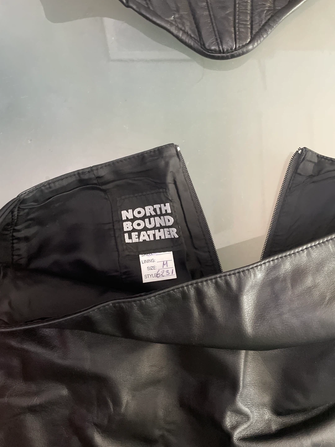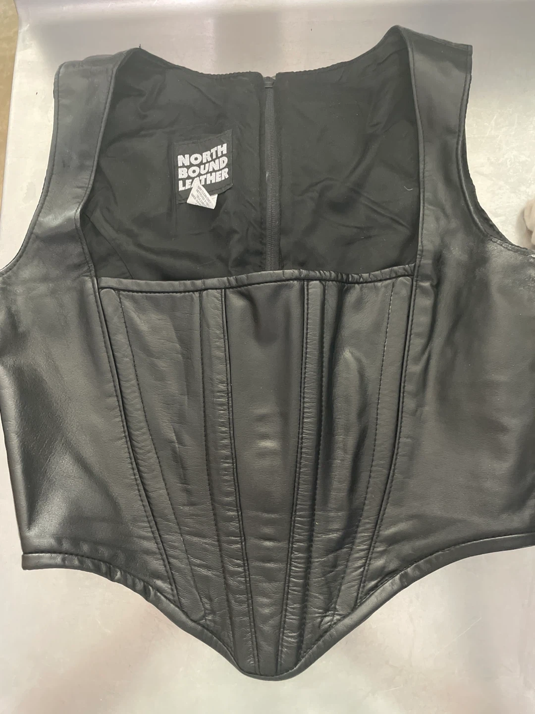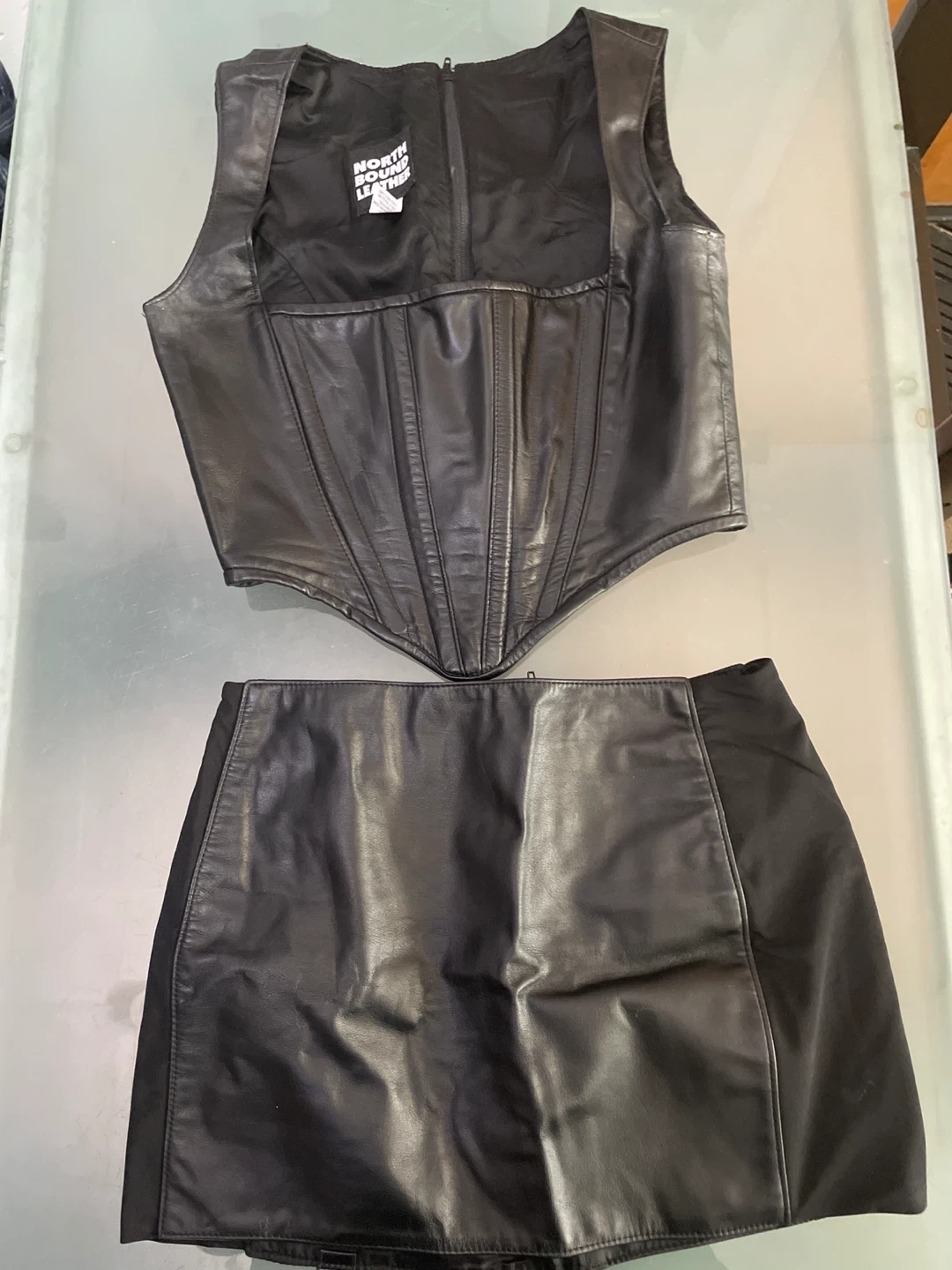 This is a black leather corset vest and matching skirt set from North Bound Leather. The vest is size medium and features a zip-up front. The skirt is also size medium. Both pieces are made of genuine leather.