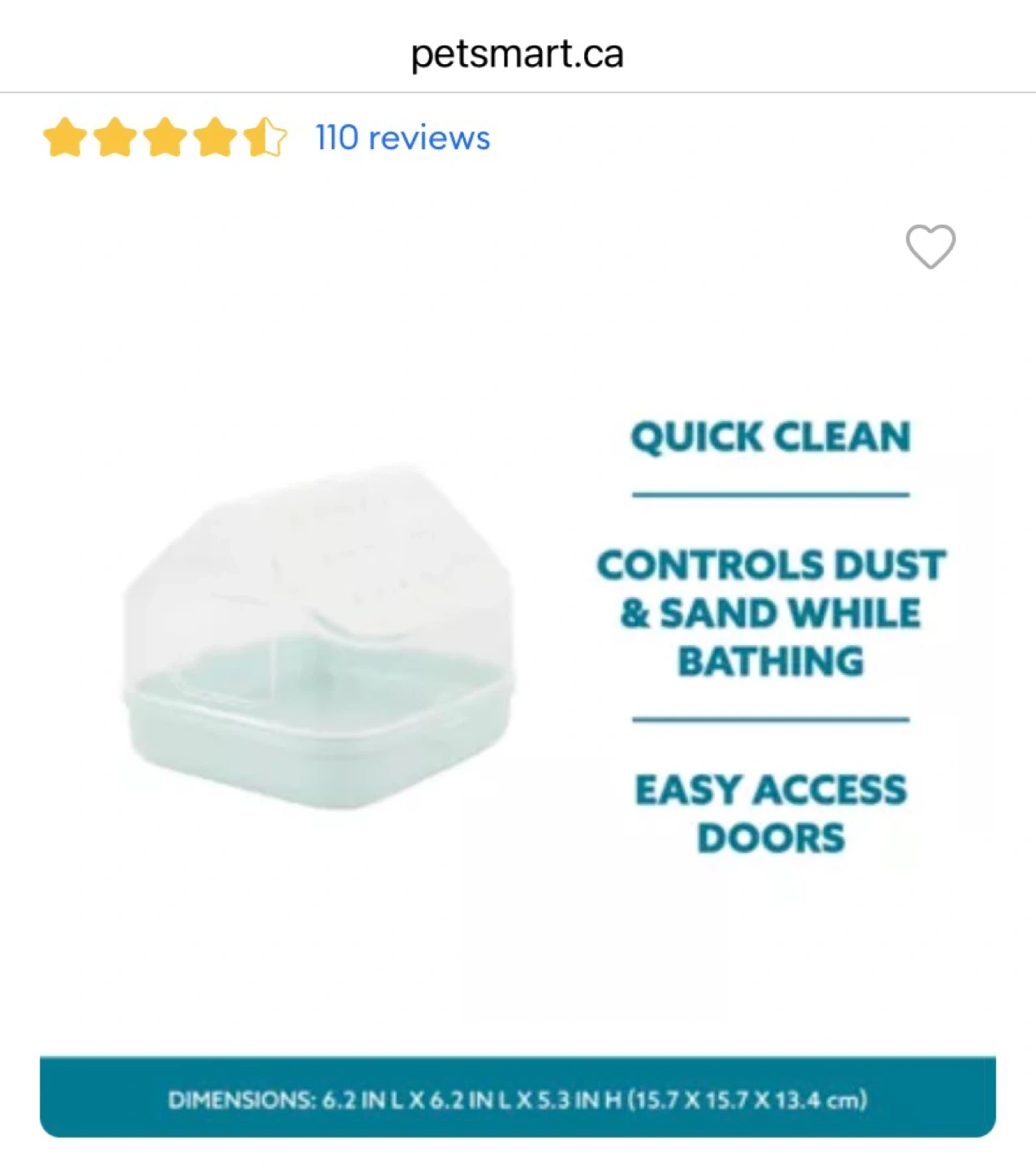 Clear plastic and light green bin. Features a clear, dome-shaped lid. Offers small ventilation holes. Designed for sand bathing. Retails for $11.99+tax at PetSmart.