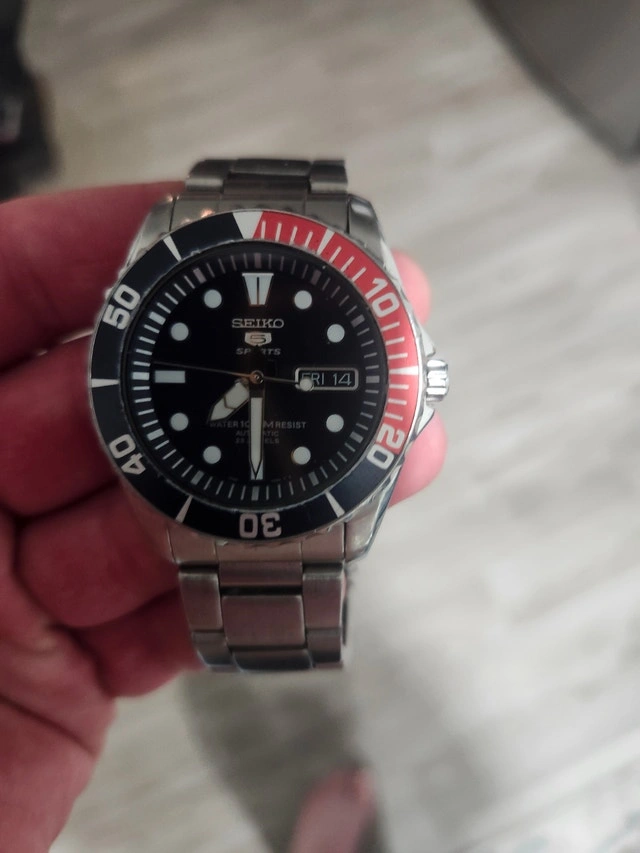 Seiko 5 Sports 23 Jewels 100m automatic watch with a stainless steel band. This model is the 7S36c. It's durable and features luminous hands. Condition is used, like new.