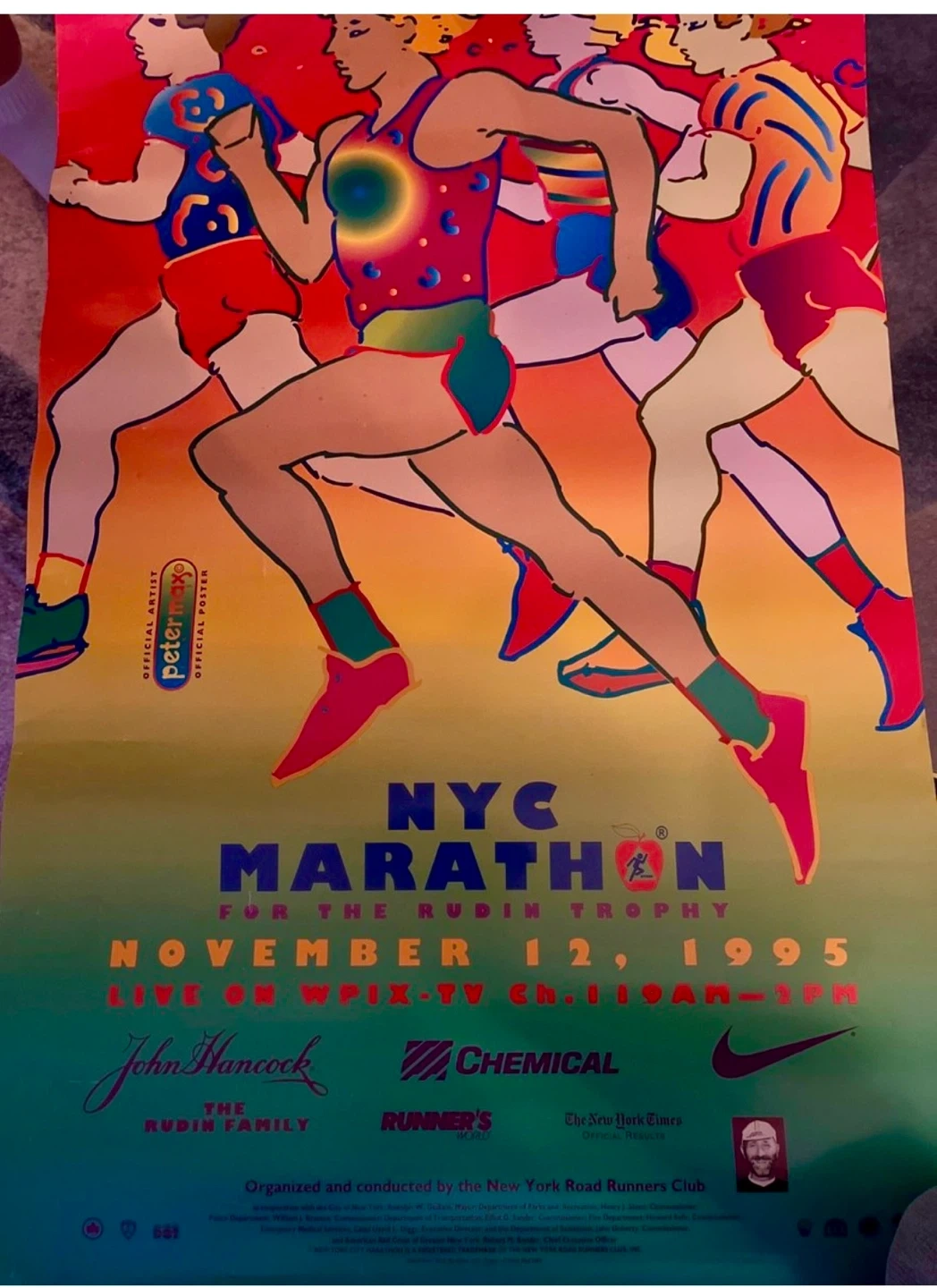 Selling a vintage NYC Marathon poster by Peter Max from November 12, 1995! This official poster is a cool piece of memorabilia for any marathon enthusiast or collector of unique art. It features the iconic Peter Max style, known for its vibrant colors and psychedelic designs. Vertical layout. Never hung or framed.