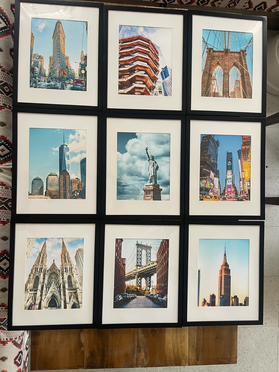 Selling a set of 9 framed prints of New York City landmarks. They are in great condition and ready to hang in your home or office. Includes iconic scenes of the Empire State Building, Times Square, the Brooklyn Bridge, and more!