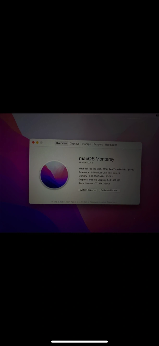 Selling a used MacBook Pro (13-inch, 2016, Four Thunderbolt 3 Ports). Fully functioning and currently running on macOS Monterey. 2 GHz dual-core Intel Core i5 processor Intel Iris Graphics 540 1536MB built-in Retina Display 8GB memory 256GB storage Battery cycle 280