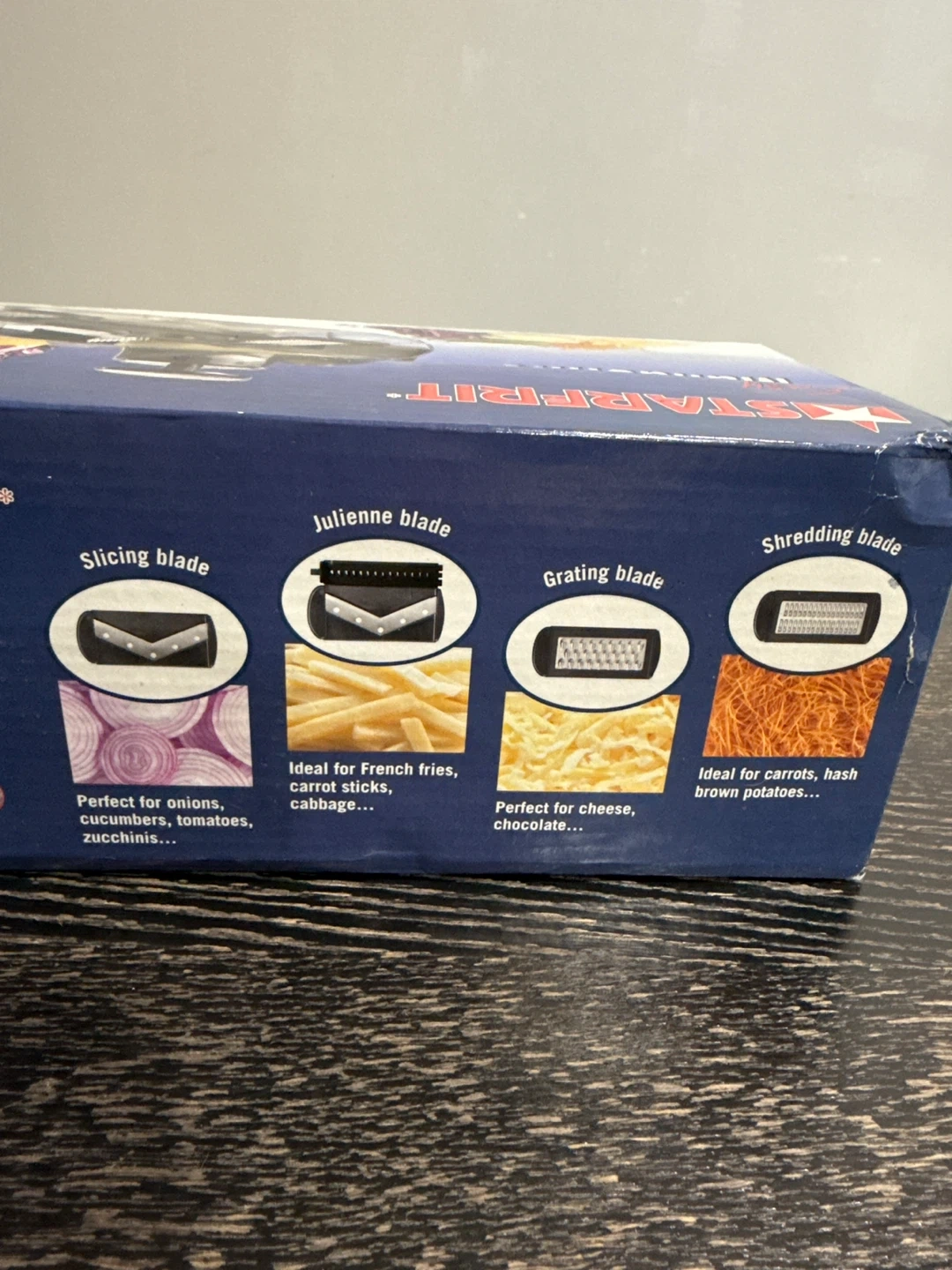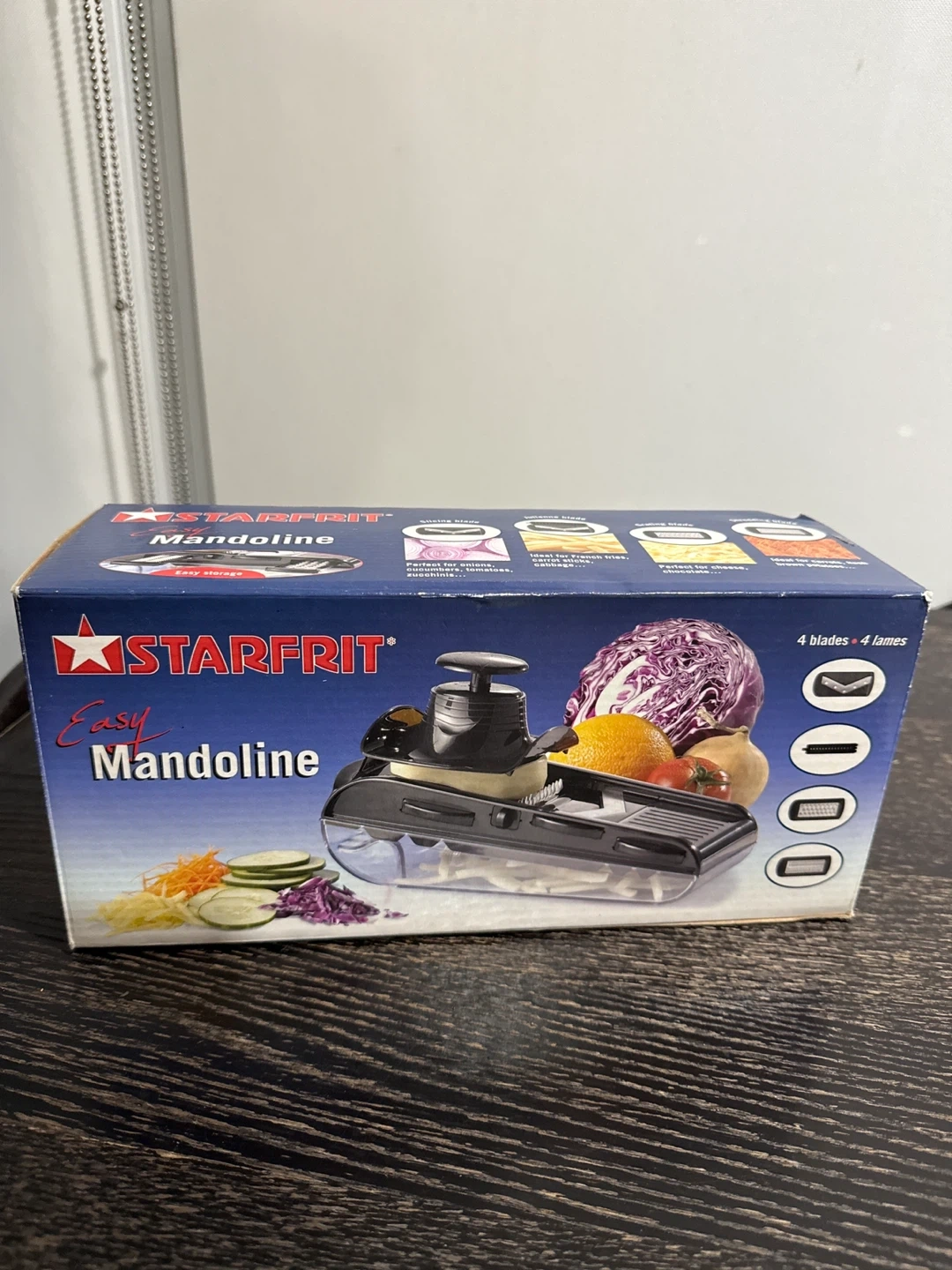 I'm selling a Starfrit Easy Mandoline. It comes with 4 blades for slicing, julienne, grating, and shredding. It's perfect for preparing onions, cucumbers, carrots, cheese, and more. The box is included!